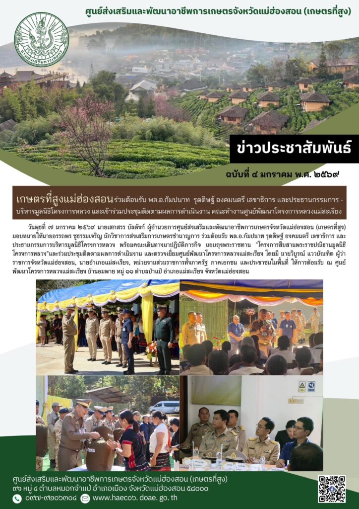 วันพุธที่ ๗ มกราคม ๒๕๖๙ นายเสกสรร บัลลังก์ ผู้อำนวยการศูนย์ส่งเสริมและพัฒนาอาชีพการเกษตรจังหวัดแม่ฮ่องสอน (เกษตรที่สูง) มอบหมายให้นายอรรถพร ชูธรรมเจริญ นักวิชาการส่งเสริมการเกษตรชำนาญการ ร่วมต้อนรับ พล.อ.กัมปนาท รุดดิษฐ์ องคมนตรี เลขาธิการ และประธานกรรมการบริหารมูลนิธิโครงการหลวง พร้อมคณะเดินทางมาปฏิบัติภารกิจ มอบถุงพระราชทาน “โครงการสืบสานพระราชปณิธานมูลนิธิโครงการหลวง”และร่วมประชุมติดตามผลการดำเนินงาน และตรวจเยี่ยมศูนย์พัฒนาโครงการหลวงแม่สะเรียง โดยมี นายวิบูรณ์ แววบัณฑิต ผู้ว่าราชการจังหวัดแม่ฮ่องสอน, นายอำเภอแม่สะเรียง, หน่วยงานส่วนราชการทั้งภาครัฐ ภาคเอกชน และประชาชนในพื้นที่ ให้การต้อนรับ ณ ศูนย์พัฒนาโครงการหลวงแม่สะเรียง บ้านอมพาย หมู่ ๑๑ ตำบลป่าแป๋ อำเภอแม่สะเรียง จังหวัดแม่ฮ่องสอน