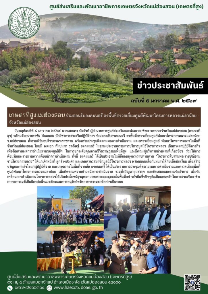 วันพฤหัสบดีที่ ๘ มกราคม ๒๕๖๙ นายเสกสรร บัลลังก์ ผู้อำนวยการศูนย์ส่งเสริมและพัฒนาอาชีพการเกษตรจังหวัดแม่ฮ่องสอน (เกษตรที่สูง) พร้อมด้วยนายราชัน ตันถนอม นักวิชาการส่งเสริมปฏิบัติการ ร่วมตอนรับองคมนตรี ลงพื้นที่ตรวจเยี่ยมศูนย์พัฒนาโครงการหลวงแม่ลาน้อย จ.แม่ฮ่องสอน ทั้งร่วมพิธีมอบสิ่งของพระราชทาน พร้อมร่วมประชุมติดตามผลการดำเนินงาน และตรวจเยี่ยมศูนย์ พัฒนาโครงการหลวงในพื้นที่จังหวัดแม่ฮ่องสอน โดยมี พลเอก กัมปนาท รุดดิษฐ์ องคมนตรี ในฐานะประธานกรรมการบริหารมูลนิธิโครงการหลวง เดินทางมาปฏิบัติภารกิจเพื่อติดตามผลการดำเนินงานของมูลนิธิฯ ในการยกระดับคุณภาพชีวิตราษฎรบนพื้นที่สูง และมีคณะผู้บริหารหน่วยงานที่เกี่ยวข้อง ร่วมให้การต้อนรับและรายงานความคืบหน้าการดำเนินงาน