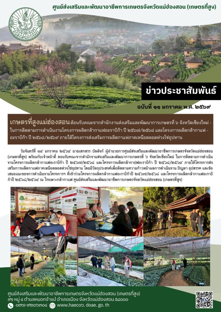 วันจันทร์ที่ ๑๙ มกราคม ๒๕๖๙ นายเสกสรร บัลลังก์ ผู้อำนวยการศูนย์ส่งเสริมและพัฒนาอาชีพการเกษตรจังหวัดแม่ฮ่องสอน (เกษตรที่สูง) พร้อมกับเจ้าหน้าที่ตอนรับคณะจากสำนักงานส่งเสริมและพัฒนาการเกษตรที่ ๖ จังหวัดเชียงใหม่ ในการติดตามการดำเนินงานโครงการผลิตกล้ากาแฟอะราบิก้า ปี ๒๕๖๗/๒๕๖๘ และโครงการผลิตกล้ากาปฟอะราบิก้า ปี ๒๕๖๘/๒๕๖๙ ภายใต้โครงการส่งเสริมการผลิตกาแฟภาคเหนือตลอดห่วงโซ่อุปทาน โดยมีวัตถุประสงค์เพื่อติดตามความก้าวหน้าผลการดำเนินงาน ปัญหา อุปสรรค และข้อเสนอแนะของการดำเนินงานโครงการฯ ที่เข้าร่วมโครงการผลิตกล้ากาแฟอะราบิก้าปี ๒๕๖๗/๒๕๖๘ และโครงการผลิตกล้ากาแฟอะราบิก้าปี ๒๕๖๘/๒๕๖๙ ณ โรงเพาะกล้ากาแฟ ศูนย์ส่งเสริมและพัฒนาอาชีพการเกษตรจังหวัดแม่ฮ่องสอน (เกษตรที่สูง)