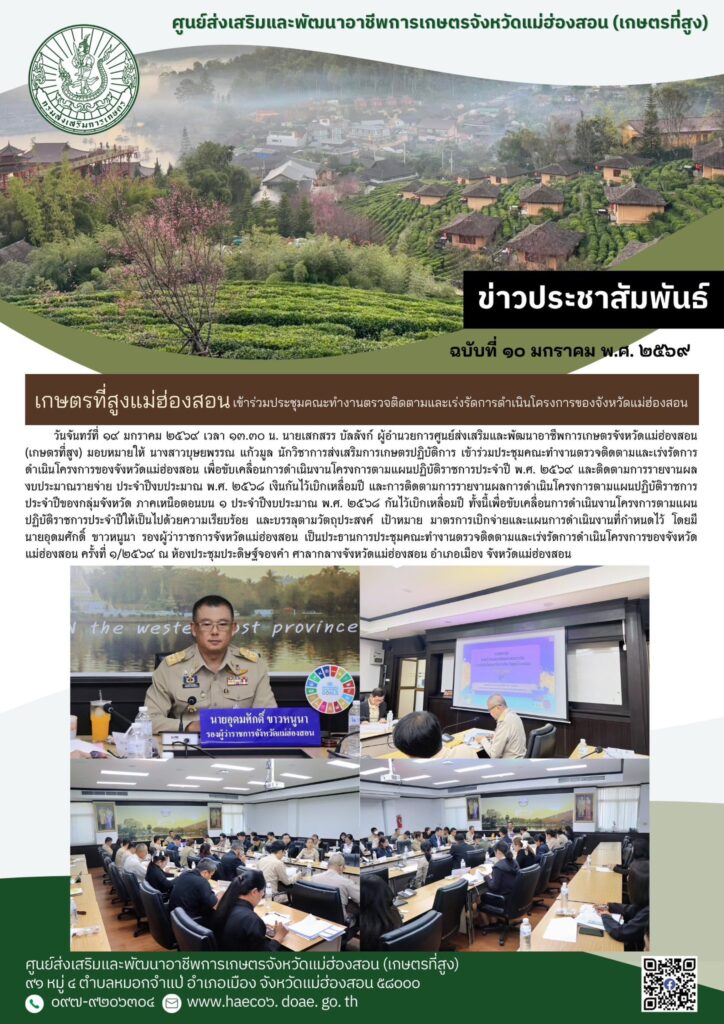 วันจันทร์ที่ ๑๙ มกราคม ๒๕๖๙ เวลา ๑๓.๓๐ น. นายเสกสรร บัลลังก์ ผู้อำนวยการศูนย์ส่งเสริมและพัฒนาอาชีพการเกษตรจังหวัดแม่ฮ่องสอน (เกษตรที่สูง) มอบหมายให้ นางสาวบุษยพรรณ แก้วมูล นักวิชาการส่งเสริมการเกษตรปฏิบัติการ เข้าร่วมประชุมคณะทำงานตรวจติดตามและเร่งรัดการดำเนินโครงการของจังหวัดแม่ฮ่องสอน เพื่อขับเคลื่อนการดำเนินงานโครงการตามแผนปฏิบัติราชการประจำปี พ.ศ. ๒๕๖๙ และติดตามการรายงานผลงบประมาณรายจ่าย ประจำปีงบประมาณ พ.ศ. ๒๕๖๘ เงินกันไว้เบิกเหลื่อมปี และการติดตามการรายงานผลการดำเนินโครงการตามแผนปฏิบัติราชการประจำปีของกลุ่มจังหวัด ภาคเหนือตอนบน ๑ ประจำปีงบประมาณ พ.ศ. ๒๕๖๘ กันไว้เบิกเหลื่อมปี ทั้งนี้เพื่อขับเคลื่อนการดำเนินงานโครงการตามแผนปฏิบัติราชการประจำปีให้เป็นไปด้วยความเรียบร้อย และบรรลุตามวัตถุประสงค์ เป้าหมาย มาตรการเบิกจ่ายและแผนการดำเนินงานที่กำหนดไว้ โดยมีนายอุดมศักดิ์ ขาวหนูนา รองผู้ว่าราชการจังหวัดแม่ฮ่องสอน เป็นประธานการประชุมคณะทำงานตรวจติดตามและเร่งรัดการดำเนินโครงการของจังหวัดแม่ฮ่องสอน ครั้งที่ ๑/๒๕๖๙ ณ ห้องประชุมประดิษฐ์จองคำ ศาลากลางจังหวัดแม่ฮ่องสอน อำเภอเมือง จังหวัดแม่ฮ่องสอน