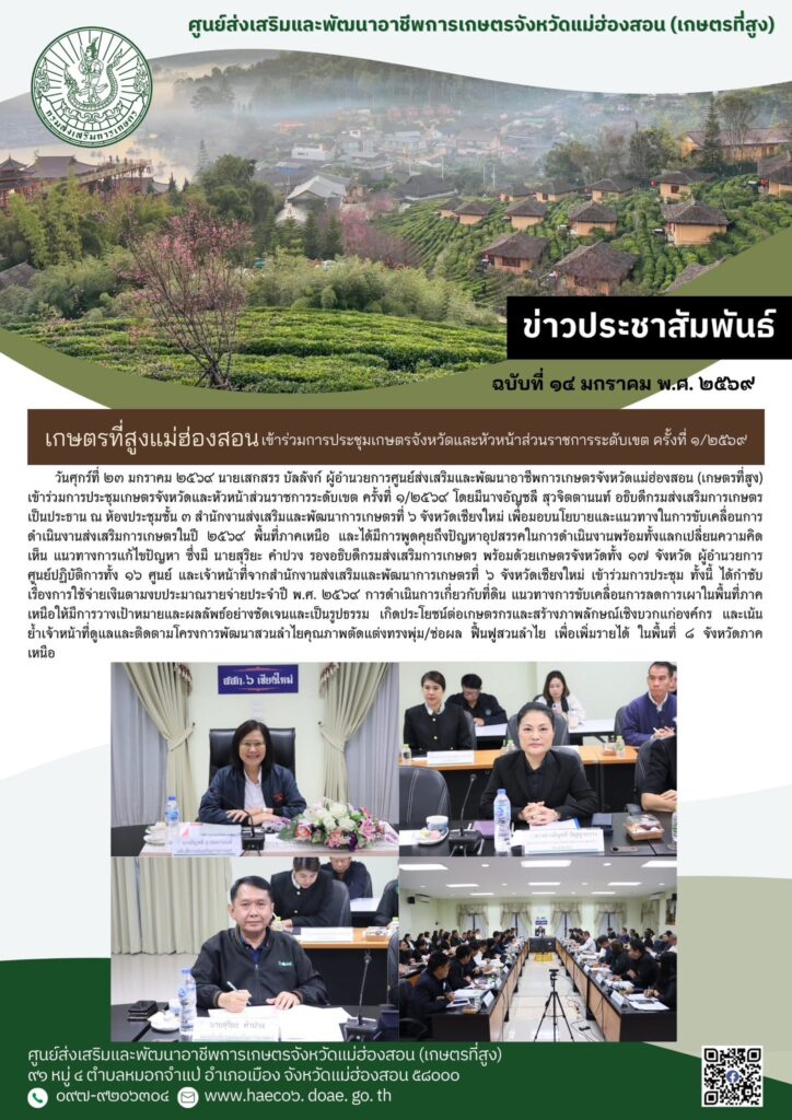 วันศุกร์ที่ ๒๓ มกราคม ๒๕๖๙ นายเสกสรร บัลลังก์ ผู้อำนวยการศูนย์ส่งเสริมและพัฒนาอาชีพการเกษตรจังหวัดแม่ฮ่องสอน (เกษตรที่สูง) เข้าร่วมการประชุมเกษตรจังหวัดและหัวหน้าส่วนราชการระดับเขต ครั้งที่ ๑/๒๕๖๙ โดยมีนางอัญชลี สุวจิตตานนท์ อธิบดีกรมส่งเสริมการเกษตร เป็นประธาน ณ ห้องประชุมชั้น ๓ สำนักงานส่งเสริมและพัฒนาการเกษตรที่ ๖ จังหวัดเชียงใหม่ เพื่อมอบนโยบายและแนวทางในการขับเคลื่อนการดำเนินงานส่งเสริมการเกษตรในปี ๒๕๖๙ พื้นที่ภาคเหนือ และได้มีการพูดคุยถึงปัญหาอุปสรรคในการดำเนินงานพร้อมทั้งแลกเปลี่ยนความคิดเห็น แนวทางการแก้ไขปัญหา ซึ่งมี นายสุริยะ คำปวง รองอธิบดีกรมส่งเสริมการเกษตร พร้อมด้วยเกษตรจังหวัดทั้ง ๑๗ จังหวัด ผู้อำนวยการศูนย์ปฏิบัติการทั้ง ๑๖ ศูนย์ และเจ้าหน้าที่จากสำนักงานส่งเสริมและพัฒนาการเกษตรที่ ๖ จังหวัดเชียงใหม่ เข้าร่วมการประชุม ทั้งนี้ ได้กำชับเรื่องการใช้จ่ายเงินตามงบประมาณรายจ่ายประจำปี พ.ศ. ๒๕๖๙ การดำเนินการเกี่ยวกับที่ดิน แนวทางการขับเคลื่อนการลดการเผาในพื้นที่ภาคเหนือให้มีการวางเป้าหมายและผลลัพธ์อย่างชัดเจนและเป็นรูปธรรม เกิดประโยชน์ต่อเกษตรกรและสร้างภาพลักษณ์เชิงบวกแก่องค์กร และเน้นย้ำเจ้าหน้าที่ดูแลและติดตามโครงการพัฒนาสวนลำไยคุณภาพตัดแต่งทรงพุ่ม/ช่อผล ฟื้นฟูสวนลำไย เพื่อเพิ่มรายได้ ในพื้นที่ ๘ จังหวัดภาคเหนือ