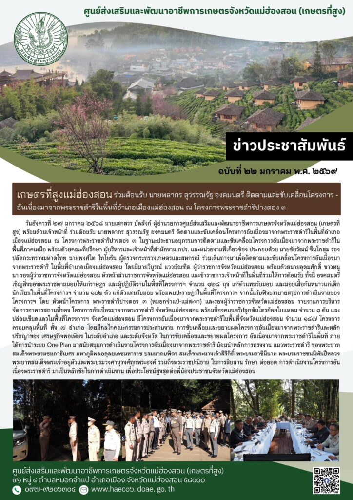 วันอังคารที่ ๒๗ มกราคม ๒๕๖๘ นายเสกสรร บัลลังก์ ผู้อำนวยการศูนย์ส่งเสริมและพัฒนาอาชีพการเกษตรจังหวัดแม่ฮ่องสอน (เกษตรที่สูง) พร้อมด้วยเจ้าหน้าที่ ร่วมต้อนรับ นายพลากร สุวรรณรัฐ องคมนตรี ติดตามและขับเคลื่อนโครงการอันเนื่องมาจากพระราชดำริในพื้นที่อำเภอเมืองแม่ฮ่องสอน ณ โครงการพระราชดำริปางตอง ๓ ในฐานะประธานอนุกรรมการติดตามและขับเคลื่อนโครงการอันเนื่องมาจากพระราชดำริในพื้นที่ภาคเหนือ พร้อมด้วยคณะที่ปรึกษา ผู้บริหารและเจ้าหน้าที่สำนักงาน กปร. และหน่วยงานที่เกี่ยวข้อง ประกอบด้วย นายชัยวัฒน์ ชื่นโกสุม รองปลัดกระทรวงมหาดไทย นายพงศ์ไท ไทโยธิน ผู้ตรวจกระทรวงเกษตรและสหกรณ์ ร่วมเดินทางมาเพื่อติดตามและขับเคลื่อนโครงการอันเนื่องมาจากพระราชดำริ ในพื้นที่อำเภอเมืองแม่ฮ่องสอน โดยมีนายวิบูรณ์ แววบัณฑิต ผู้ว่าราชการจังหวัดแม่ฮ่องสอน พร้อมด้วยนายอุดมศักดิ์ ขาวหนูนา รองผู้ว่าราชการจังหวัดแม่ฮ่องสอน หัวหน้าส่วนราชการจังหวัดแม่ฮ่องสอน และข้าราชการเจ้าหน้าที่ในพื้นที่ร่วมให้การต้อนรับ