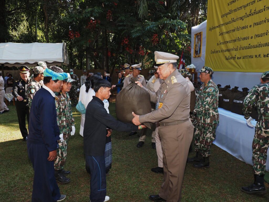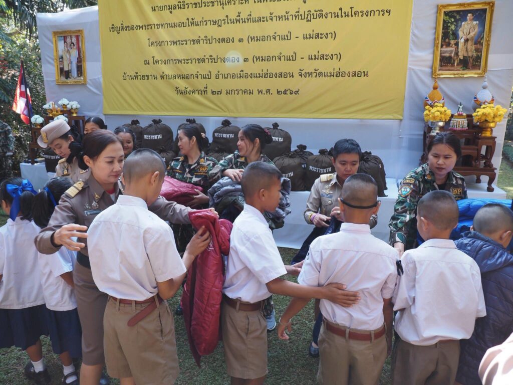 ทั้งนี้ องคมนตรีเชิญสิ่งของพระราชทานมอบให้แก่ราษฎร และผู้ปฏิบัติงานในพื้นที่โครงการฯ จำนวน ๑๒๘ ถุง แก่ตัวแทนรับมอบ และมอบเสื้อกันหนาวแก่เด็กนักเรียนในพื้นที่โครงการฯ จำนวน ๑๐๒ ตัว แก่ตัวแทนรับมอบ พร้อมพบปะราษฎรในพื้นที่โครงการฯ จากนั้นรับฟังบรรยายสรุปการดำเนินงานของโครงการฯ โดย หัวหน้าโครงการ พระราชดำริปางตอง ๓ (หมอกจำแป่-แม่สะงา) และรองผู้ว่าราชการจังหวัดแม่ฮ่องสอน รายงานการบริหารจัดการอาคารสถานที่ของ โครงการอันเนื่องมาจากพระราชดำริ จังหวัดแม่ฮ่องสอน พร้อมนี้องคมนตรีปลูกต้นไทรย้อยใบแหลม จำนวน ๑ ต้น และปล่อยเขียดแลวในพื้นที่โครงการฯ