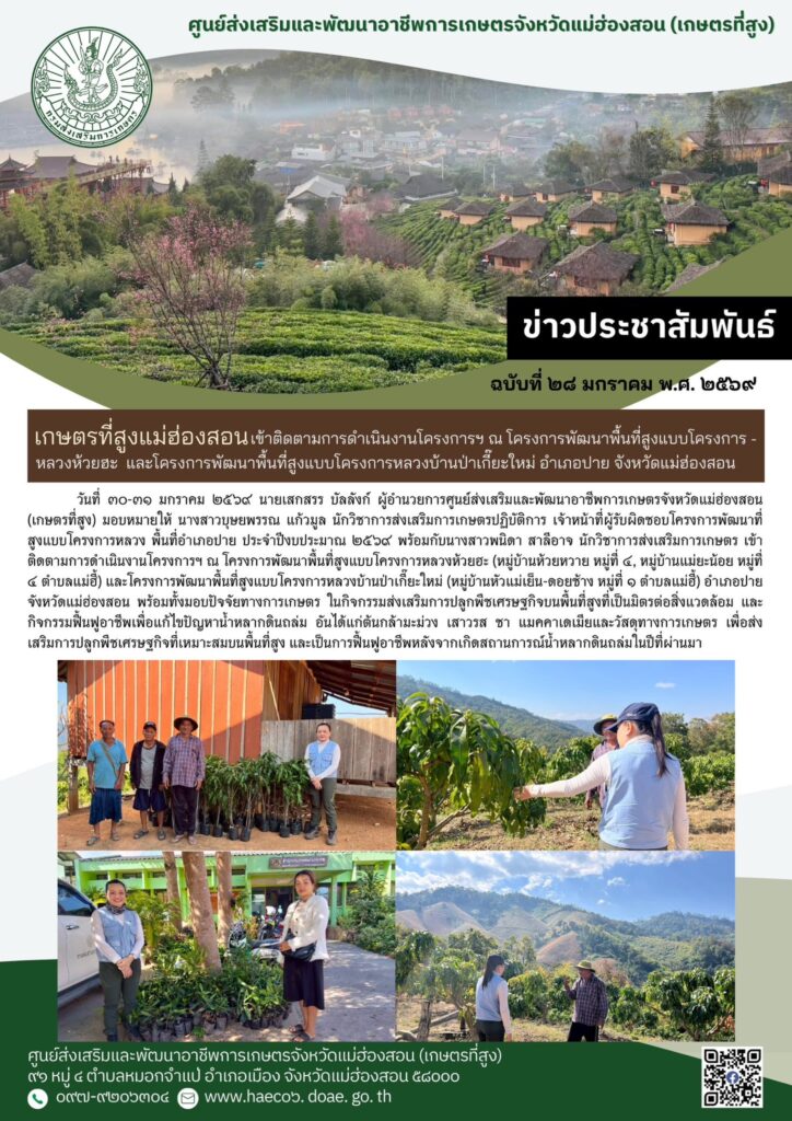 วันที่ ๓๐-๓๑ มกราคม ๒๕๖๙ นายเสกสรร บัลลังก์ ผู้อำนวยการศูนย์ส่งเสริมและพัฒนาอาชีพการเกษตรจังหวัดแม่ฮ่องสอน (เกษตรที่สูง) มอบหมายให้ นางสาวบุษยพรรณ แก้วมูล นักวิชาการส่งเสริมการเกษตรปฏิบัติการ เจ้าหน้าที่ผู้รับผิดชอบโครงการพัฒนาที่สูงแบบโครงการหลวง พื้นที่อำเภอปาย ประจำปีงบประมาณ ๒๕๖๙ พร้อมกับนางสาวพนิดา สาลีอาจ นักวิชาการส่งเสริมการเกษตร เข้าติดตามการดำเนินงานโครงการฯ ณ โครงการพัฒนาพื้นที่สูงแบบโครงการหลวงห้วยฮะ (หมู่บ้านห้วยหวาย หมู่ที่ ๔, หมู่บ้านแม่ยะน้อย หมู่ที่ ๔ ตำบลแม่ฮี้) และโครงการพัฒนาพื้นที่สูงแบบโครงการหลวงบ้านป่าเกี๊ยะใหม่ (หมู่บ้านหัวแม่เย็น-ดอยช้าง หมู่ที่ ๑ ตำบลแม่ฮี้) อำเภอปาย จังหวัดแม่ฮ่องสอน พร้อมทั้งมอบปัจจัยทางการเกษตร ในกิจกรรมส่งเสริมการปลูกพืชเศรษฐกิจบนพื้นที่สูงที่เป็นมิตรต่อสิ่งแวดล้อม และกิจกรรมฟื้นฟูอาชีพเพื่อแก้ไขปัญหาน้ำหลากดินถล่ม อันได้แก่ต้นกล้ามะม่วง เสาวรส ชา แมคคาเดเมียและวัสดุทางการเกษตร เพื่อส่งเสริมการปลูกพืชเศรษฐกิจที่เหมาะสมบนพื้นที่สูง และเป็นการฟื้นฟูอาชีพหลังจากเกิดสถานการณ์น้ำหลากดินถล่มในปีที่ผ่านมา