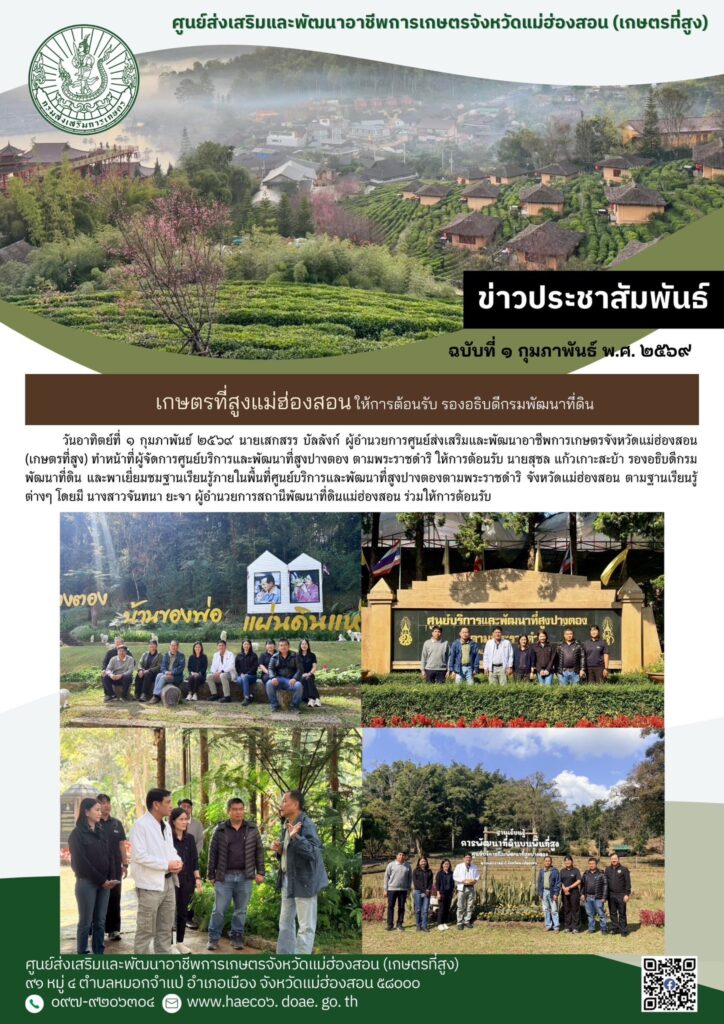 วันอาทิตย์ที่ ๑ กุมภาพันธ์ ๒๕๖๙ นายเสกสรร บัลลังก์ ผู้อำนวยการศูนย์ส่งเสริมและพัฒนาอาชีพการเกษตรจังหวัดแม่ฮ่องสอน (เกษตรที่สูง) ทำหน้าที่ผู้จัดการศูนย์บริการและพัฒนาที่สูงปางตอง ตามพระราชดำริ ให้การต้อนรับ นายสุชล แก้วเกาะสะบ้า รองอธิบดีกรมพัฒนาที่ดิน และพาเยี่ยมชมฐานเรียนรู้ภายในพื้นที่ศูนย์บริการและพัฒนาที่สูงปางตองตามพระราชดำริ จังหวัดแม่ฮ่องสอน ตามฐานเรียนรู้ต่างๆ โดยมี นางสาวจันทนา ยะจา ผู้อำนวยการสถานีพัฒนาที่ดินแม่ฮ่องสอน ร่วมให้การต้อนรับ