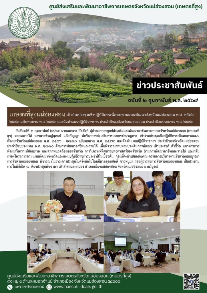 วันจันทร์ที่ ๒ กุมภาพันธ์ ๒๕๖๙ นายเสกสรร บัลลังก์ ผู้อำนวยการศูนย์ส่งเสริมและพัฒนาอาชีพการเกษตรจังหวัดแม่ฮ่องสอน (เกษตรที่สูง) มอบหมายให้ นางสาวทิพญ์สุคนธ์ แก้วกัญญา นักวิชาการส่งเสริมการเกษตรชำนาญการ เข้าร่วมประชุมเชิงปฏิบัติการเพื่อทบทวนแผนพัฒนาจังหวัดแม่ฮ่องสอน พ.ศ. ๒๕๖๖ – ๒๕๗๐ ฉบับทบทวน พ.ศ. ๒๕๗๐ และจัดทำแผนปฏิบัติราชการ ประจำปีของจังหวัดแม่ฮ่องสอน ประจำปีงบประมาณ พ.ศ. ๒๕๗๐ ด้านการพัฒนาอาชีพและรายได้ เพื่อพิจารณาทบทวนประเด็นการพัฒนา เป้าประสงค์ ตัวชี้วัด แนวทางการพัฒนาวิเคราะห์ศักยภาพ และสภาพแวดล้อมของจังหวัด การวิเคราะห์ทิศทางยุทธศาสตร์ของจังหวัด ด้านการพัฒนาอาชีพและรายได้ และกลั่นกรองโครงการตามแผนพัฒนาจังหวัดและแผนปฏิบัติราชการประจำปีในเบื้องต้น ก่อนที่จะนำเสนอต่อคณะกรรมการบริหารงานจังหวัดแบบบูรณาการจังหวัดแม่ฮ่องสอน พิจารณาในวาระการประชุมในครั้งต่อไปโดยมีนายอุดมศักดิ์ ขาวหนูนา รองผู้ว่าราชการจังหวัดแม่ฮ่องสอน เป็นประธานการในพิธีเปิด ณ ห้องประชุมพิชชาพร เฮ้าส์ ตำบลผาบ่อง อำเภอเมืองแม่ฮ่องสอน จังหวัดแม่ฮ่องสอน