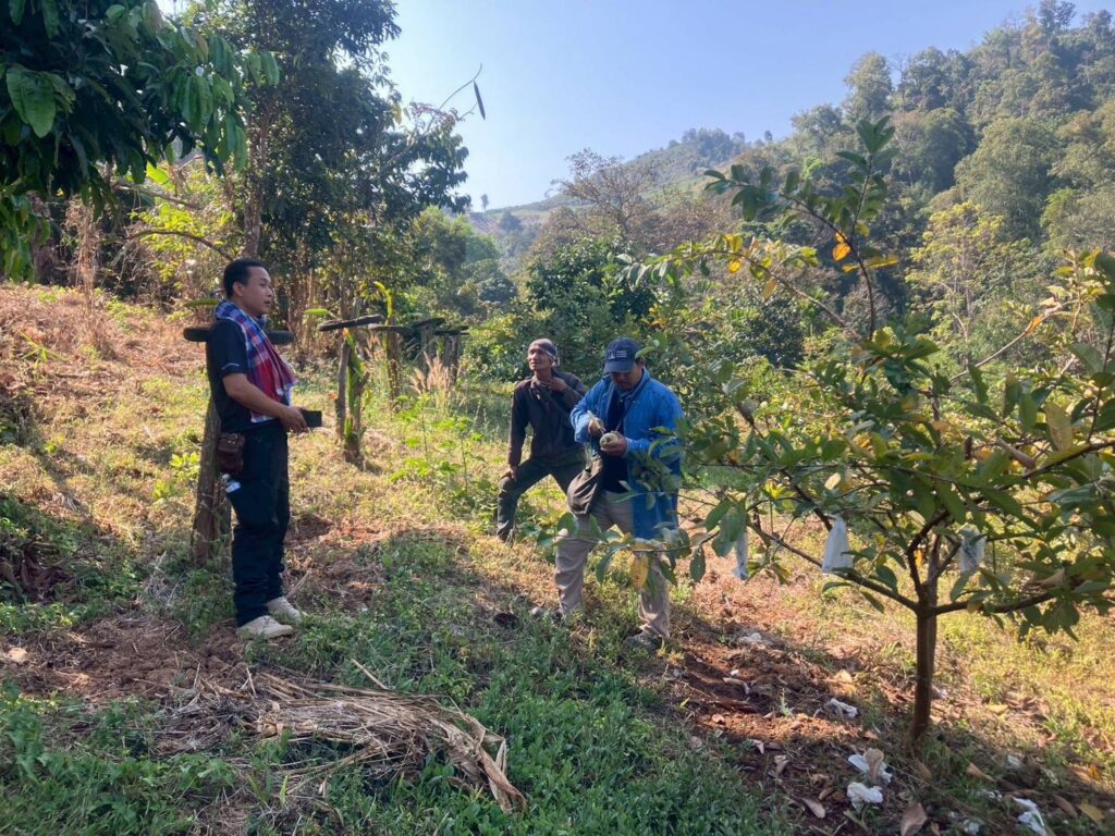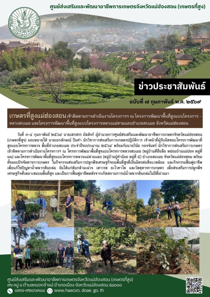 วันที่ ๓-๔ กุมภาพันธ์ ๒๕๖๙ นายเสกสรร บัลลังก์ ผู้อำนวยการศูนย์ส่งเสริมและพัฒนาอาชีพการเกษตรจังหวัดแม่ฮ่องสอน (เกษตรที่สูง) มอบหมายให้ นายเอกลักษณ์ ปินคำ นักวิชาการส่งเสริมการเกษตรปฏิบัติการ เจ้าหน้าที่ผู้รับผิดชอบโครงการพัฒนาที่สูงแบบโครงการหลวง พื้นที่อำเภอสบเมย ประจำปีงบประมาณ ๒๕๖๙ พร้อมกับนายวินัย กองจันทร์ นักวิชาการส่งเสริมการเกษตร เข้าติดตามการดำเนินงานโครงการฯ ณ โครงการพัฒนาพื้นที่สูงแบบโครงการหลวงสบเมย (หมู่บ้านทีฮือลือ หย่อมบ้านแม่ปอง หมู่ที่ ๑๑) และโครงการพัฒนาพื้นที่สูงแบบโครงการหลวงแม่สามแลบ (หมู่บ้านปู่คำน้อย หมู่ที่ ๕) อำเภอสบเมย จังหวัดแม่ฮ่องสอน พร้อมทั้งมอบปัจจัยทางการเกษตร ในกิจกรรมส่งเสริมการปลูกพืชเศรษฐกิจบนพื้นที่สูงที่เป็นมิตรต่อสิ่งแวดล้อม และกิจกรรมฟื้นฟูอาชีพเพื่อแก้ไขปัญหาน้ำหลากดินถล่ม อันได้แก่ต้นกล้ามะม่วง เสาวรส อะโวคาโด และวัสดุทางการเกษตร เพื่อส่งเสริมการปลูกพืชเศรษฐกิจที่เหมาะสมบนพื้นที่สูง และเป็นการฟื้นฟูอาชีพหลังจากเกิดสถานการณ์น้ำหลากดินถล่มในปีที่ผ่านมา