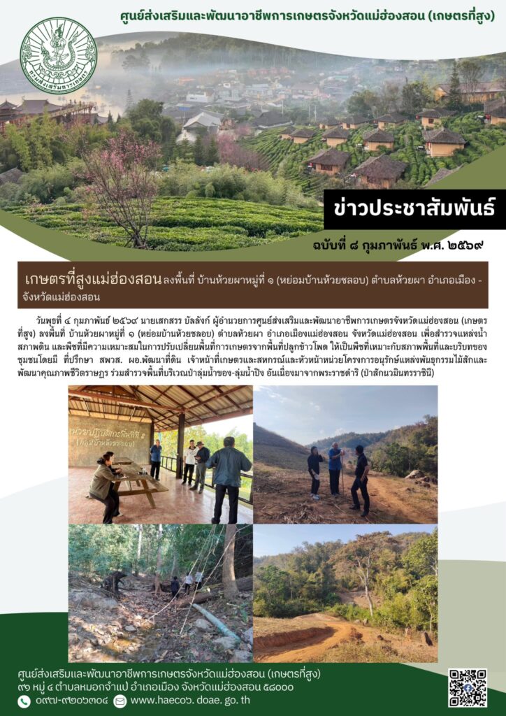 วันพุธที่ ๔ กุมภาพันธ์ ๒๕๖๙ นายเสกสรร บัลลังก์ ผู้อำนวยการศูนย์ส่งเสริมและพัฒนาอาชีพการเกษตรจังหวัดแม่ฮ่องสอน (เกษตรที่สูง) ลงพื้นที่ บ้านห้วยผาหมู่ที่ ๑ (หย่อมบ้านห้วยชลอบ) ตำบลห้วยผา อำเภอเมืองแม่ฮ่องสอน จังหวัดแม่ฮ่องสอน เพื่อสำรวจแหล่งน้ำ สภาพดิน และพืชที่มีความเหมาะสมในการปรับเปลี่ยนพื้นที่การเกษตรจากพื้นที่ปลูกข้าวโพด ให้เป็นพืชที่เหมาะกับสภาพพื้นที่และบริบทของชุมชนโดยมี ที่ปรึกษา สพวส. ผอ.พัฒนาที่ดิน เจ้าหน้าที่เกษตรและสหกรณ์และหัวหน้าหน่วยโครงการอนุรักษ์แหล่งพันธุกรรมไม้สักและพัฒนาคุณภาพชีวิตราษฏร ร่วมสำรวจพื้นที่บริเวณป่าลุ่มน้ำของ-ลุ่มน้ำปิง อันเนื่องมาจากพระราชดำริ (ป่าสักนวมินทรราชินี)