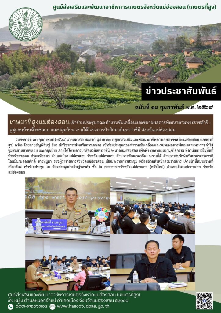 วันอังคารที่ ๑๐ กุมภาพันธ์ ๒๕๖๙ นายเสกสรร บัลลังก์ ผู้อำนวยการศูนย์ส่งเสริมและพัฒนาอาชีพการเกษตรจังหวัดแม่ฮ่องสอน (เกษตรที่สูง) พร้อมด้วยนายธัญพิสิษฐ์ ธิมา นักวิชาการส่งเสริมการเกษตร เข้าร่วมประชุมคณะทำงานขับเคลื่อนและขยายผลการพัฒนาตามพระราชดำริสู่ชุมชนบ้านห้วยซลอบ และกลุ่มบ้าน ภายใต้โครงการป่าสักนวมินทรราชินี จังหวัดแม่ฮ่องสอน เพื่อพิจารณาแผนงาน/กิจกรรม ที่ดำเนินการในพื้นที่บ้านห้วยซลอบ ตำบลห้วยผา อำเภอเมืองแม่ฮ่องสอน จังหวัดแม่ฮ่องสอน ด้านการพัฒนาอาชีพและรายได้ ด้านการอนุรักษ์ทรัพยากรธรรมชาติ โดยมีนายอุดมศักดิ์ ขาวหนูนา รองผู้ว่าราชการจังหวัดแม่ฮ่องสอน เป็นประธานการประชุม พร้อมด้วยหัวหน้าส่วนราชการ เจ้าหน้าที่หน่วยงานที่เกี่ยวข้อง เข้าร่วมประชุม ณ ห้องประชุมประดิษฐ์จองคำ ชั้น ๒ ศาลากลางจังหวัดแม่ฮ่องสอน (หลังใหม่) อำเภอเมืองแม่ฮ่องสอน จังหวัดแม่ฮ่องสอน
