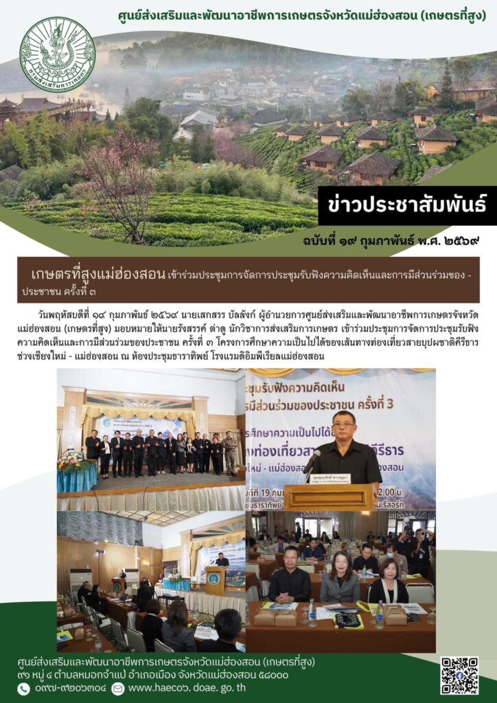 วันพฤหัสบดีที่ ๑๙ กุมภาพันธ์ ๒๕๖๙ นายเสกสรร บัลลังก์ ผู้อำนวยการศูนย์ส่งเสริมและพัฒนาอาชีพการเกษตรจังหวัดแม่ฮ่องสอน (เกษตรที่สูง) มอบหมายให้นายรังสรรค์ ต่าดู นักวิชาการส่งเสริมการเกษตร เข้าร่วมประชุมการจัดการประชุมรับฟังความคิดเห็นและการมีส่วนร่วมของประชาชน ครั้งที่ ๓ โครงการศึกษาความเป็นไปได้ของเส้นทางท่องเที่ยวสายบุปผชาติคีรีธาร ช่วงเชียงใหม่ – แม่ฮ่องสอน ณ ห้องประชุมธาราทิพย์ โรงแรมดิอิมพีเรียลแม่ฮ่องสอน