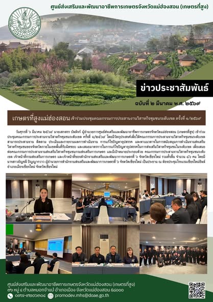 วันศุกรที่ ๖ มีนาคม ๒๕๖๙ นายเสกสรร บัลลังก์ ผู้อำนวยการศูนย์ส่งเสริมและพัฒนาอาชีพการเกษตรจังหวัดแม่ฮ่องสอน (เกษตรที่สูง) เข้าร่วมประชุมคณะกรรมการประสานงานวิสาหกิจชุมชนระดับเขต ครั้งที่ ๑/๒๕๖๙ โดยมีวัตถุประสงค์เพื่อให้คณะกรรมการประสานงานวิสาหกิจชุมชนระดับเขต สามารถประสานงาน ติดตาม ประเมินและรายงานผลการดำเนินงาน การแก้ไขปัญหาอุปสรรค และหาแนวทางในการสนับสนุนการดำเนินงานส่งเสริมวิสาหกิจชุมชนของจังหวัดภายในเขตพื้นที่รับผิดชอบ และเสนอมาตรการในการแก้ไขปัญหาอุปสรรคในการส่งเสริมวิสาหกิจชุมชนในระดับเขต เพื่อเสนอต่อคณะกรรมการประสานงานส่งเสริมวิสาหกิจชุมชนกรมส่งเสริมการเกษตร และมีเป้าหมายประกอบด้วย คณะกรรมการประสานงานวิสาหกิจชุมชนระดับเขต เจ้าหน้าที่กรมส่งเสริมการเกษตร และเจ้าหน้าที่ของสำนักงานส่งเสริมและพัฒนาการเกษตรที่ ๖ จังหวัดเชียงใหม่ รวมทั้งสิ้น จำนวน ๔๖ คน โดยมีนางสาวอัญชลี ปัญญากวาว ผู้อำนวยการสำนักงานส่งเสริมและพัฒนาการเกษตรที่ ๖ จังหวัดเชียงใหม่ เป็นประธาน ณ ห้องประชุมโรงแรมเชียงใหม่ฮิลล์ อำเภอเมืองเชียงใหม่ จังหวัดเชียงใหม่