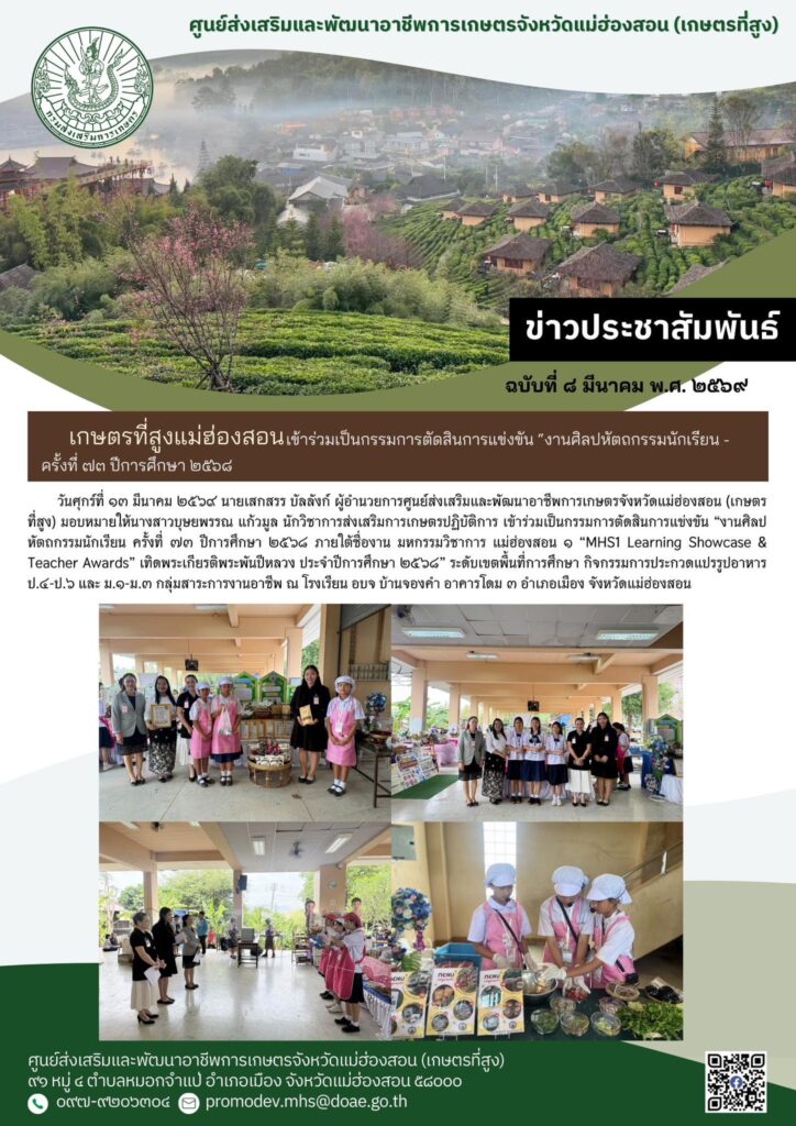 วันศุกร์ที่ ๑๓ มีนาคม ๒๕๖๙ นายเสกสรร บัลลังก์ ผู้อำนวยการศูนย์ส่งเสริมและพัฒนาอาชีพการเกษตรจังหวัดแม่ฮ่องสอน (เกษตรที่สูง) มอบหมายให้นางสาวบุษยพรรณ แก้วมูล นักวิชาการส่งเสริมการเกษตรปฏิบัติการ เข้าร่วมเป็นกรรมการตัดสินการแข่งขัน “งานศิลปหัตถกรรมนักเรียน ครั้งที่ ๗๓ ปีการศึกษา ๒๕๖๘ ภายใต้ชื่องาน มหกรรมวิชาการ แม่ฮ่องสอน ๑ “MHS1 Learning Showcase & Teacher Awards” เทิดพระเกียรติพระพันปีหลวง ประจำปีการศึกษา ๒๕๖๘” ระดับเขตพื้นที่การศึกษา กิจกรรมการประกวดแปรรูปอาหาร ป.๔-ป.๖ และ ม.๑-ม.๓ กลุ่มสาระการงานอาชีพ ณ โรงเรียน อบจ บ้านจองคำ อาคารโดม ๓ อำเภอเมือง จังหวัดแม่ฮ่องสอน