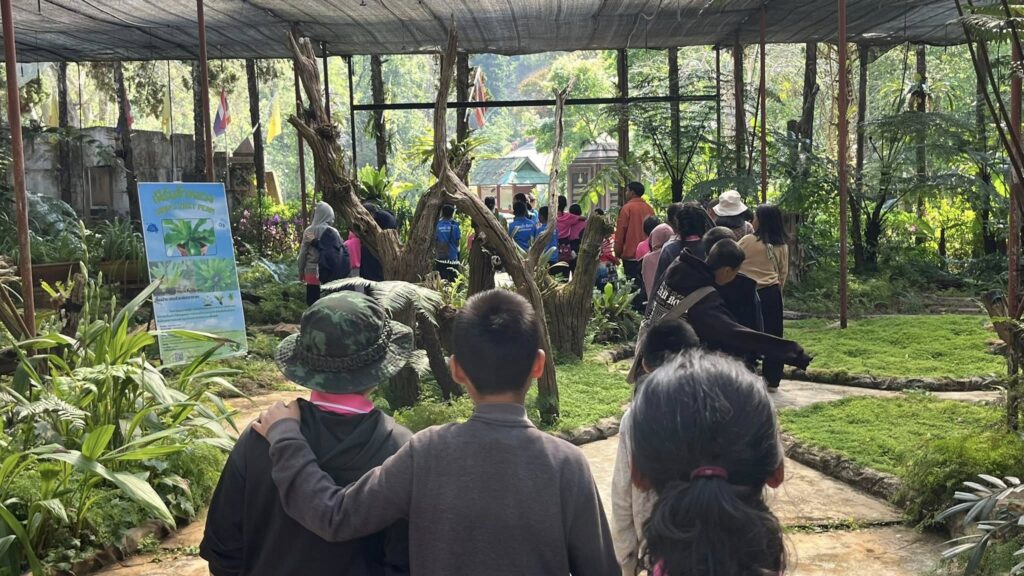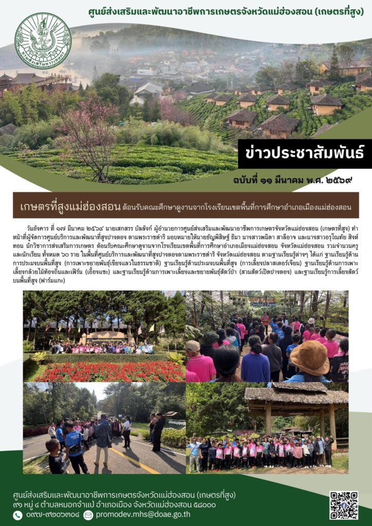 วันอังคาร ที่ ๑๗ มีนาคม ๒๕๖๙ นายเสกสรร บัลลังก์ ผู้อำนวยการศูนย์ส่งเสริมและพัฒนาอาชีพการเกษตรจังหวัดแม่ฮ่องสอน (เกษตรที่สูง) ทำหน้าที่ผู้จัดการศูนย์บริการและพัฒนาที่สูงปางตอง ตามพระราชดำริ มอบหมายให้นายธัญพิสิษฐ์ ธิมา นางสาวพนิดา สาลีอาจ และนางสาวอรุโณทัย สิงห์ทอน นักวิชาการส่งเสริมการเกษตร ต้อนรับคณะศึกษาดูงานจากโรงเรียนเขตพื้นที่การศึกษาอำเภอเมืองแม่ฮ่องสอน จังหวัดแม่ฮ่องสอน รวมจำนวนครูและนักเรียน ทั้งหมด ๖๐ ราย ในพื้นที่ศูนย์บริการและพัฒนาที่สูงปางตองตามพระราชดำริ จังหวัดแม่ฮ่องสอน ตามฐานเรียนรู้ต่างๆ ได้แก่ ฐานเรียนรู้ด้านการประมงบนพื้นที่สูง (การเพาะขยายพันธ์ุเขียงแลวในธรรมชาติ) ฐานเรียนรู้ด้านประมงบนพื้นที่สูง (การเลี้ยงปลาสเตอร์เจียน) ฐานเรียนรู้ด้านการเพาะเลี้ยงกล้วยไม้ท้องถิ่นและเฟิร์น (เอื้องแซะ) และฐานเรียนรู้ด้านการเพาะเลี้ยงและขยายพันธุ์สัตว์ป่า (สวนสัตว์เปิดปางตอง) และฐานเรียนรู้การเลี้ยงสัตว์บนพื้นที่สูง (ฟาร์มแกะ)