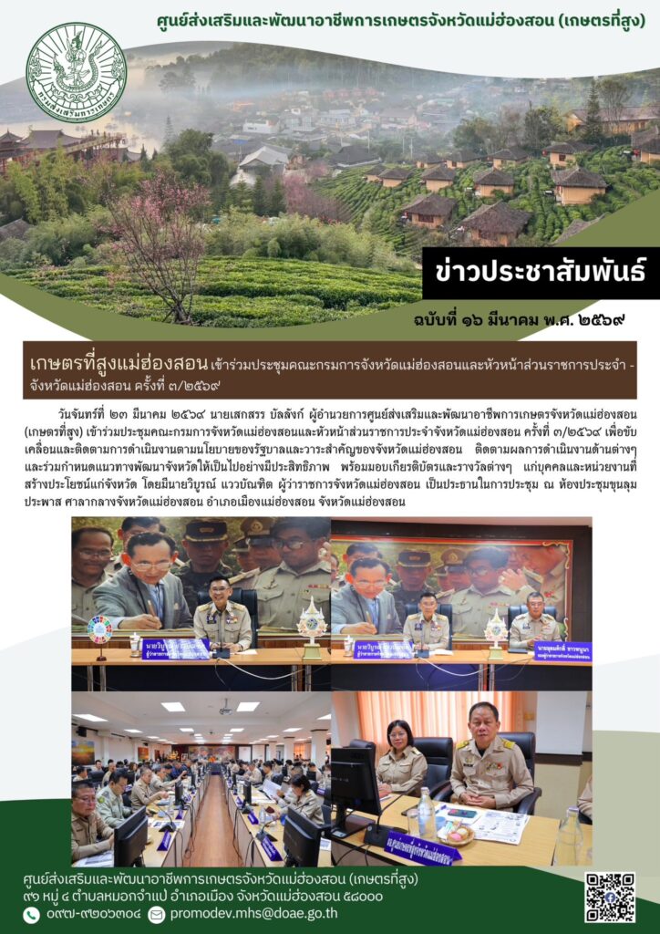 วันจันทร์ที่ ๒๓ มีนาคม ๒๕๖๙ นายเสกสรร บัลลังก์ ผู้อำนวยการศูนย์ส่งเสริมและพัฒนาอาชีพการเกษตรจังหวัดแม่ฮ่องสอน (เกษตรที่สูง) เข้าร่วมประชุมคณะกรมการจังหวัดแม่ฮ่องสอนและหัวหน้าส่วนราชการประจำจังหวัดแม่ฮ่องสอน ครั้งที่ ๓/๒๕๖๙ เพื่อขับเคลื่อนและติดตามการดำเนินงานตามนโยบายของรัฐบาลและวาระสำคัญของจังหวัดแม่ฮ่องสอน ติดตามผลการดำเนินงานด้านต่างๆ และร่วมกำหนดแนวทางพัฒนาจังหวัดให้เป็นไปอย่างมีประสิทธิภาพ พร้อมมอบเกียรติบัตรและรางวัลต่างๆ แก่บุคคลและหน่วยงานที่สร้างประโยชน์แก่จังหวัด โดยมีนายวิบูรณ์ แววบัณฑิต ผู้ว่าราชการจังหวัดแม่ฮ่องสอน เป็นประธานในการประชุม ณ ห้องประชุมขุนลุมประพาส ศาลากลางจังหวัดแม่ฮ่องสอน อำเภอเมืองแม่ฮ่องสอน จังหวัดแม่ฮ่องสอน