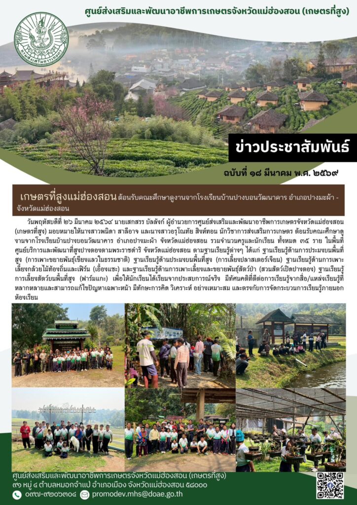 วันพฤหัสบดีที่ ๒๖ มีนาคม ๒๕๖๙ นายเสกสรร บัลลังก์ ผู้อำนวยการศูนย์ส่งเสริมและพัฒนาอาชีพการเกษตรจังหวัดแม่ฮ่องสอน (เกษตรที่สูง) มอบหมายให้นางสาวพนิดา สาลีอาจ และนางสาวอรุโณทัย สิงห์ทอน นักวิชาการส่งเสริมการเกษตร ต้อนรับคณะศึกษาดูงานจากโรงเรียนบ้านปางบอนวัฒนาคาร อำเภอปางมะผ้า จังหวัดแม่ฮ่องสอน รวมจำนวนครูและนักเรียน ทั้งหมด ๓๕ ราย ในพื้นที่ศูนย์บริการและพัฒนาที่สูงปางตองตามพระราชดำริ จังหวัดแม่ฮ่องสอน ตามฐานเรียนรู้ต่างๆ ได้แก่ ฐานเรียนรู้ด้านการประมงบนพื้นที่สูง (การเพาะขยายพันธ์ุเขียงแลวในธรรมชาติ) ฐานเรียนรู้ด้านประมงบนพื้นที่สูง (การเลี้ยงปลาสเตอร์เจียน) ฐานเรียนรู้ด้านการเพาะเลี้ยงกล้วยไม้ท้องถิ่นและเฟิร์น (เอื้องแซะ) และฐานเรียนรู้ด้านการเพาะเลี้ยงและขยายพันธุ์สัตว์ป่า (สวนสัตว์เปิดปางตอง) ฐานเรียนรู้การเลี้ยงสัตว์บนพื้นที่สูง (ฟาร์มแกะ) เพื่อให้นักเรียนได้เรียนจากประสบการณ์จริง มีทัศนคติที่ตีต่อการเรียนรู้จากสื่อ/แหล่งเรียนรู้ที่หลากหลายและสามารถแก้ไขปัญหาเฉพาะหน้า มีทักษะการคิด วิเคราะห์ อย่างเหมาะสม และตรงกับการจัดกระบวนการเรียนรู้ภายนอกห้องเรียน