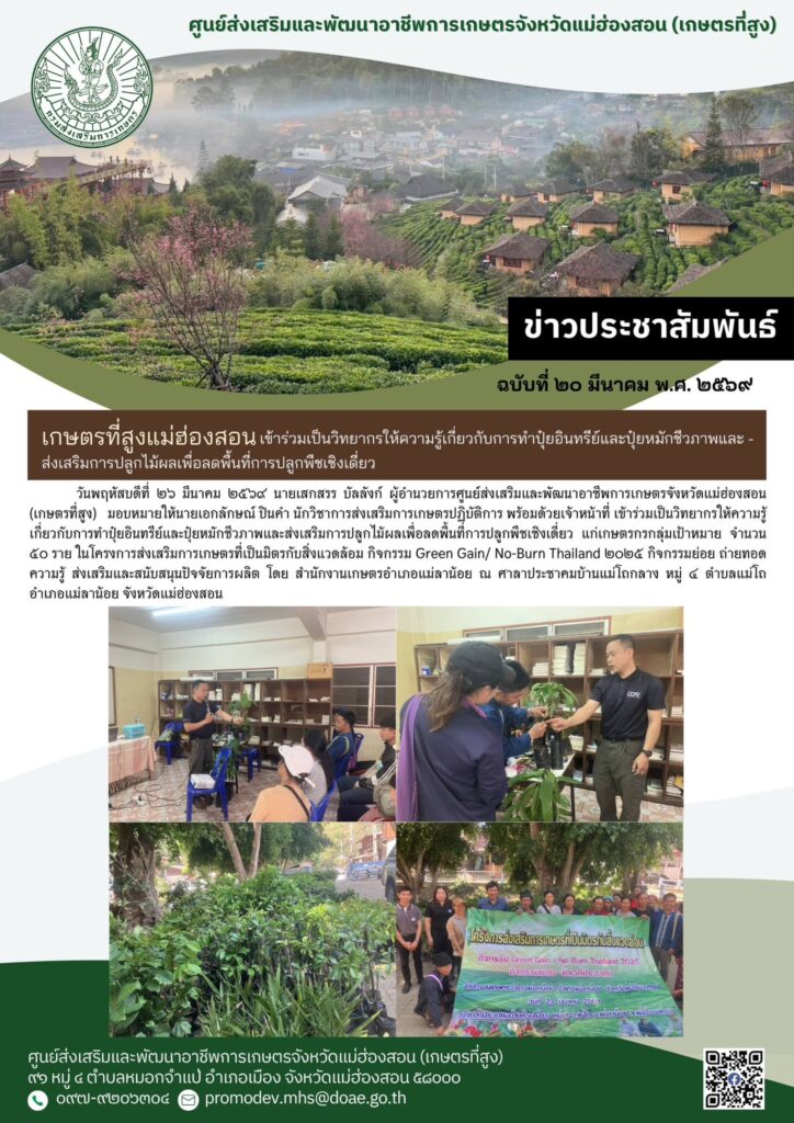 วันพฤหัสบดีที่ ๒๖ มีนาคม ๒๕๖๙ นายเสกสรร บัลลังก์ ผู้อำนวยการศูนย์ส่งเสริมและพัฒนาอาชีพการเกษตรจังหวัดแม่ฮ่องสอน (เกษตรที่สูง) มอบหมายให้นายเอกลักษณ์ ปินคำ นักวิชาการส่งเสริมการเกษตรปฏิบัติการ พร้อมด้วยเจ้าหน้าที่ เข้าร่วมเป็นวิทยากรให้ความรู้เกี่ยวกับการทำปุ๋ยอินทรีย์และปุ๋ยหมักชีวภาพและส่งเสริมการปลูกไม้ผลเพื่อลดพื้นที่การปลูกพืชเชิงเดี่ยว แก่เกษตรกรกลุ่มเป้าหมาย จำนวน ๕๐ ราย ในโครงการส่งเสริมการเกษตรที่เป็นมิตรกับสิ่งแวดล้อม กิจกรรม Green Gain/ No-Burn Thailand ๒๐๒๕ กิจกรรมย่อย ถ่ายทอดความรู้ ส่งเสริมและสนับสนุนปัจจัยการผลิต โดย สำนักงานเกษตรอำเภอแม่ลาน้อย ณ ศาลาประชาคมบ้านแม่โถกลาง หมู่ ๔ ตำบลแม่โถ อำเภอแม่ลาน้อย จังหวัดแม่ฮ่องสอน