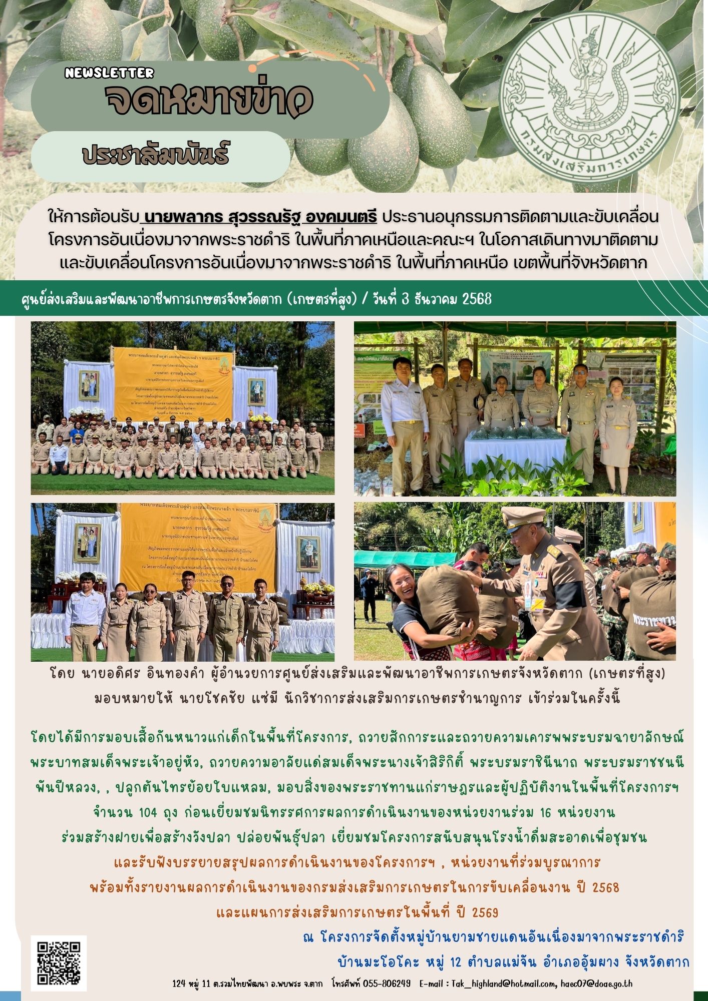 วันที่ 3 ธันวาคม 2568 ให้การต้อนรับนายพลากร สุวรรณรัฐ องคมนตรี ประธานอนุกรรมการติดตามและขับเคลื่อนโครงการอันเนื่องมาจากพระราชดำริ ในพื้นที่ภาคเหนือและคณะฯ ในโอกาสเดินทางมาติดตามและขับเคลื่อนโครงการอันเนื่องมาจากพระราชดําริ ในพื้นที่ภาคเหนือ เขตพื้นที่จังหวัดตาก