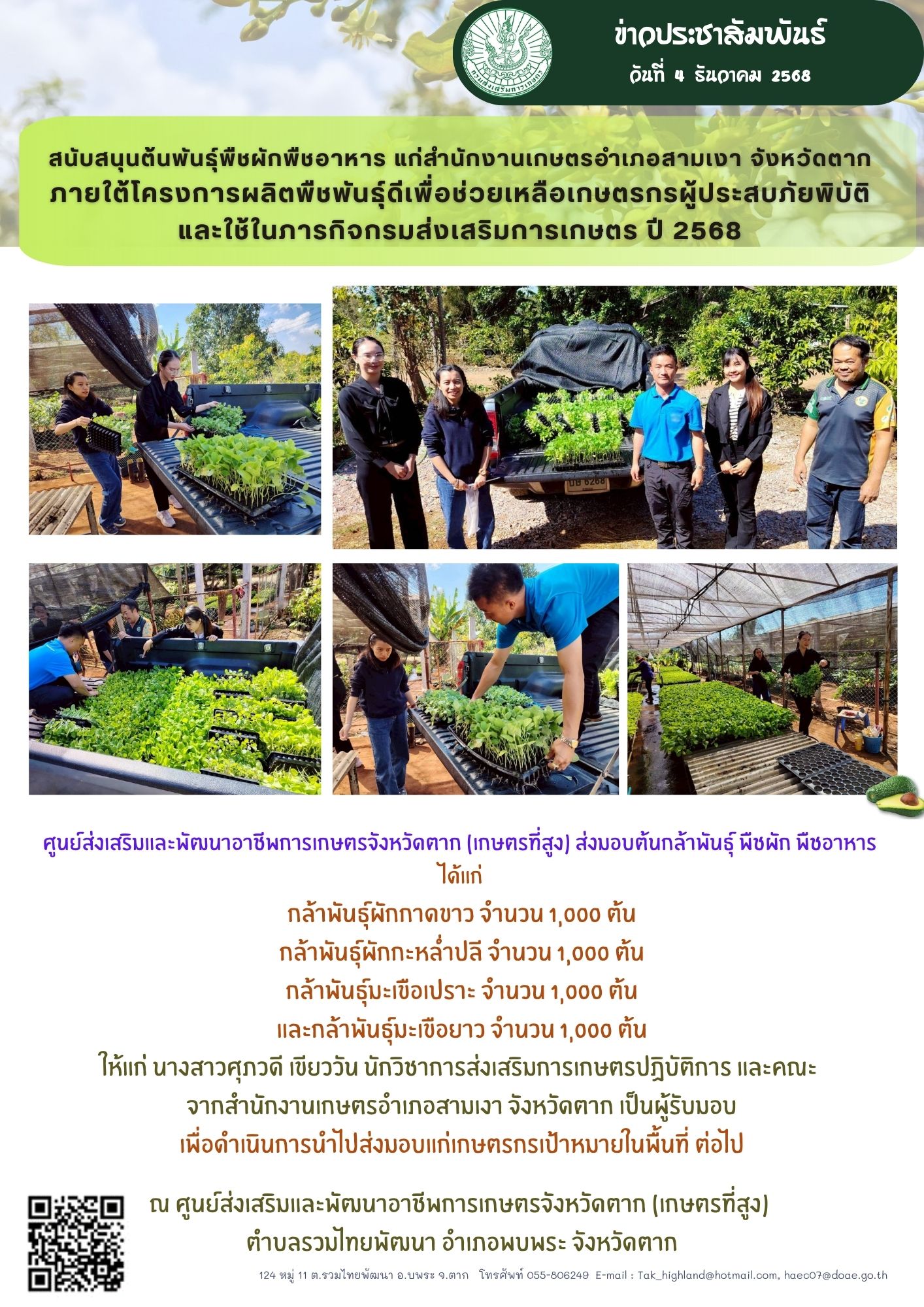 วันที่ 4 ธันวาคม 2568 เกษตรที่สูงตาก สนับสนุนต้นพันธุ์พืชผักพืชอาหาร แก่ สำนักงานเกษตรอำเภอสามเงา จังหวัดตาก