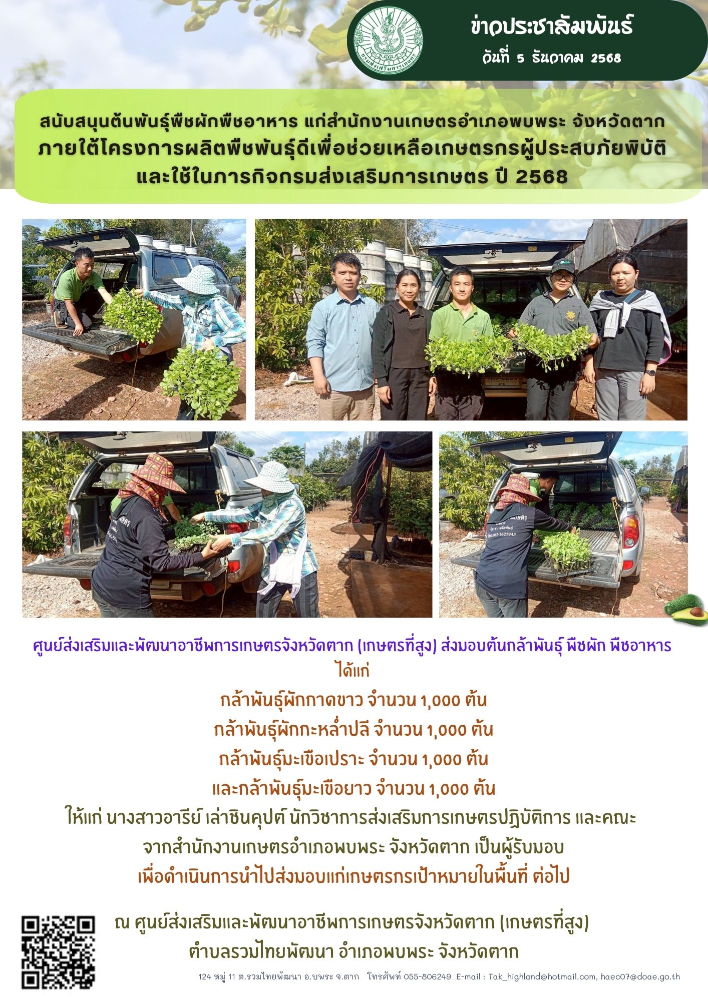 วันที่ 9 ธันวาคม 2568 เกษตรที่สูงตาก สนับสนุนต้นพันธุ์พืชผักพืชอาหาร แก่ สำนักงานเกษตรอำเภอพบพระ จังหวัดตาก
