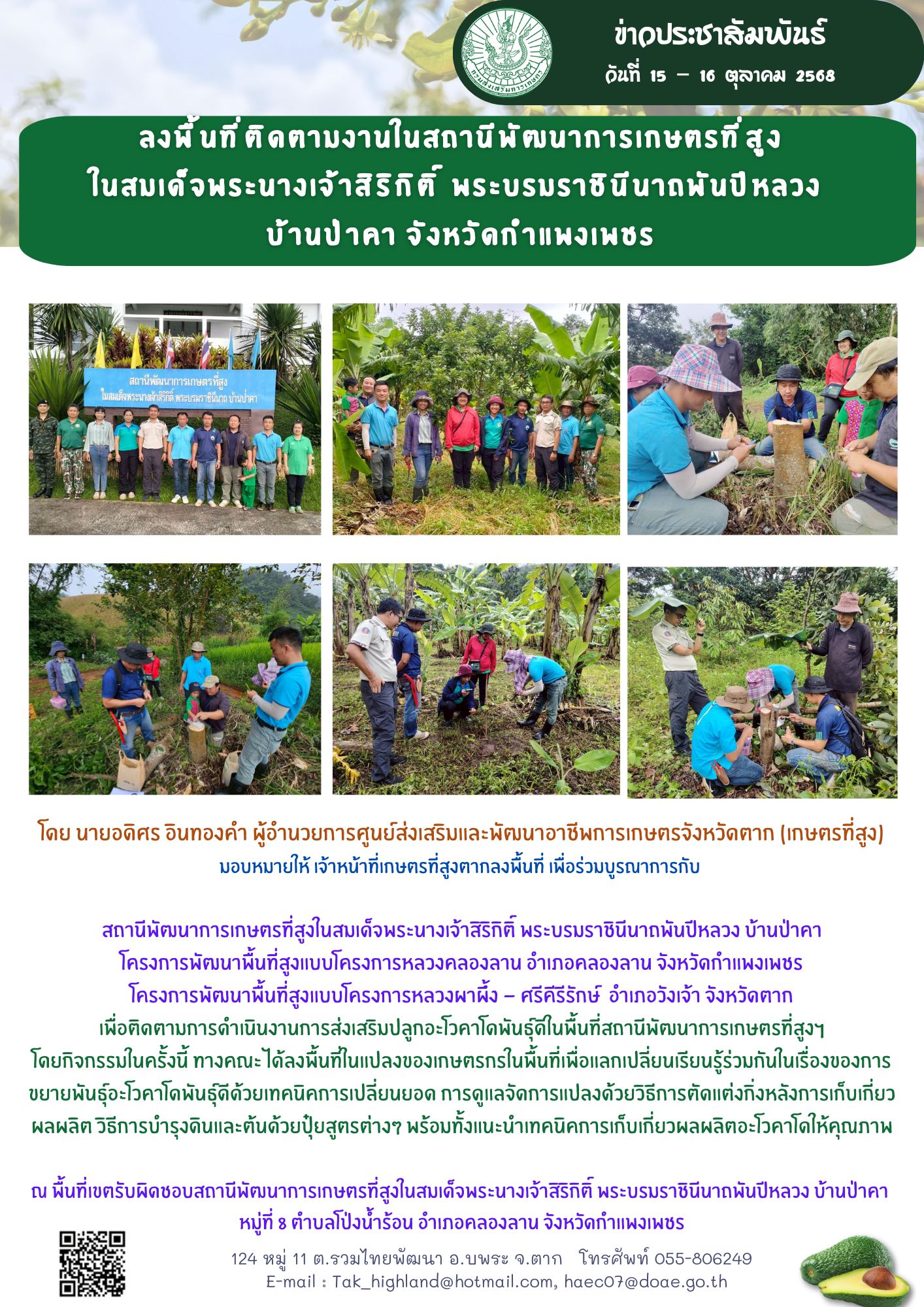 วันที่ 15 – 16 ตุลาคม 2568 เกษตรที่สูงตาก ลงพื้นที่ติดตามงานในสถานีพัฒนาการเกษตรที่สูงในสมเด็จพระนางเจ้าสิริกิติ์ พระบรมราชินีนาถพันปีหลวง บ้านป่าคา จังหวัดกำแพงเพชร