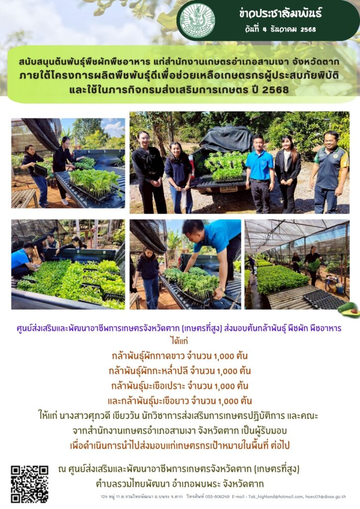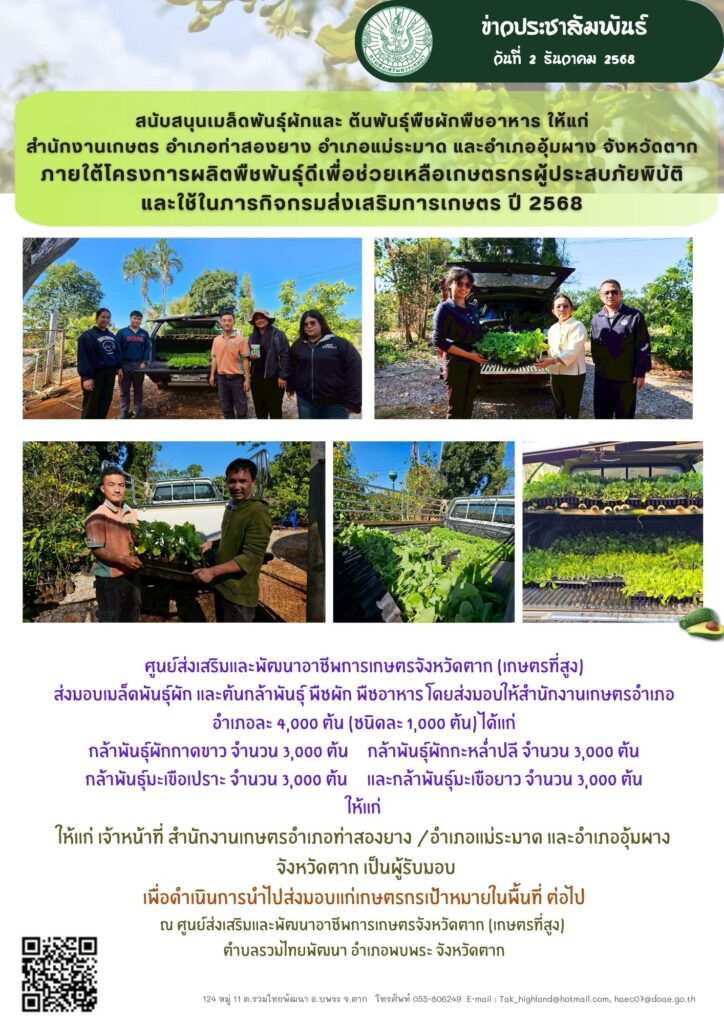 ข่าวประชาสัมพันธ์วันที่ 2 ธันวาคม 2568 เกษตรที่สูงตาก สนับสนุนต้นพันธุ์พืชผักพืชอาหาร แก่สำนักงานเกษตรอำเภอท่าสองยาง อำเภอแม่ระมาด และอำเภออุ้มผาง จังหวัดตาก haec07 / 3 ธันวาคม 2025 ศูนย์ส่งเสริมและพัฒน