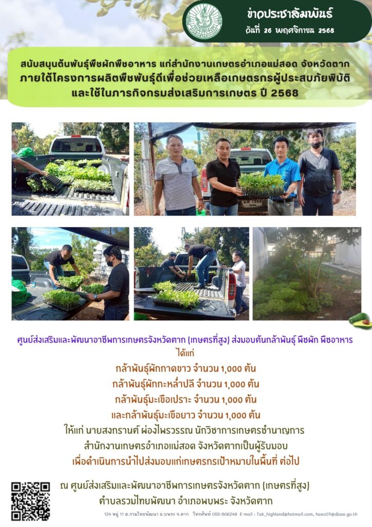 ข่าวประชาสัมพันธ์สนับสนุนต้นพันธุ์พืชผักพืชอาหาร แก่สำนักงานเกษตรอำเภอแม่สอด จังหวัดตาก haec07 / 3 ธันวาคม 2025 วันที่ 26 พฤศจิกายน