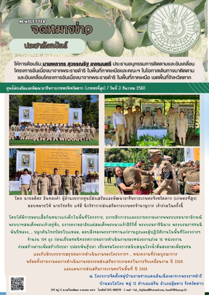 ข่าวประชาสัมพันธ์วันที่ 15 – 16 ตุลาคม 2568 เกษตรที่สูงตาก ลงพื้นที่ติดตามงานในสถานีพัฒนาการเกษตรที่สูงในสมเด็จพระนางเจ้าสิริกิติ์ พระบรมราชินีนาถพันปีหลวง บ้านป่าคา จังหวัดกำแพงเพชร haec07 / 12 พฤศจิกายน 2025 เกษตรที่สูงตาก ลงพื้