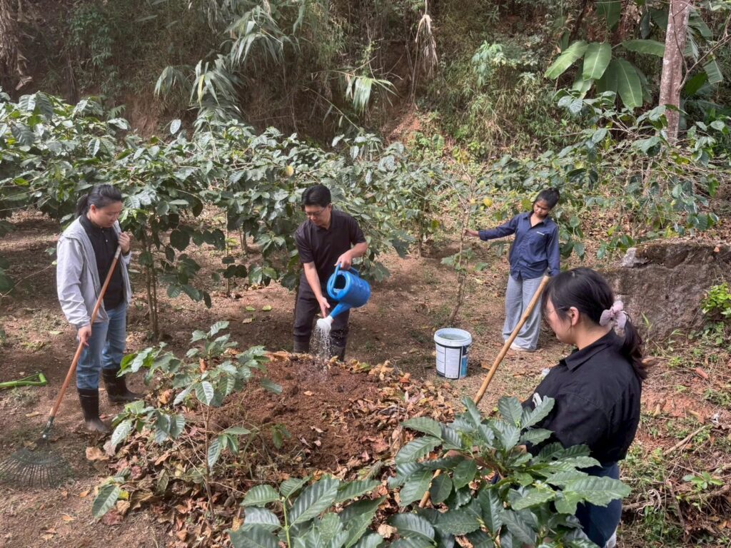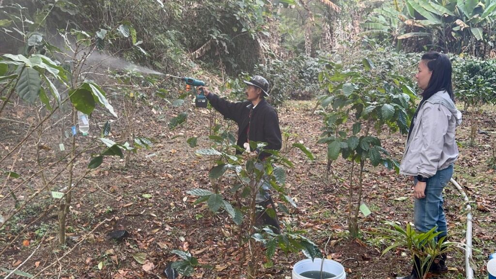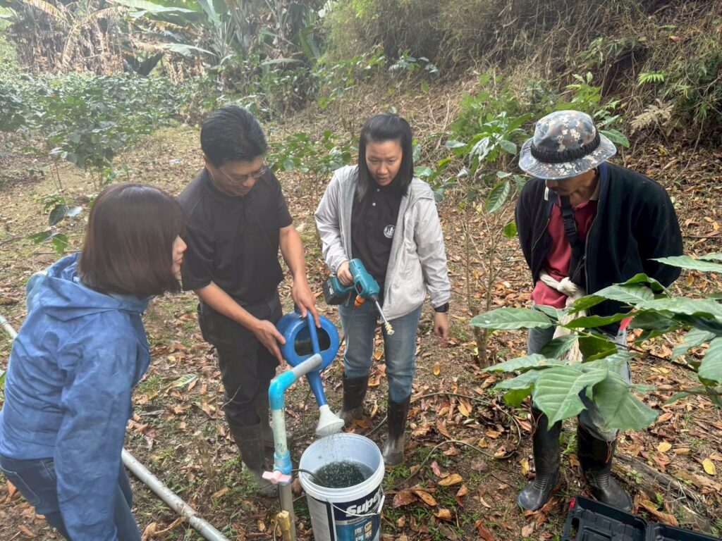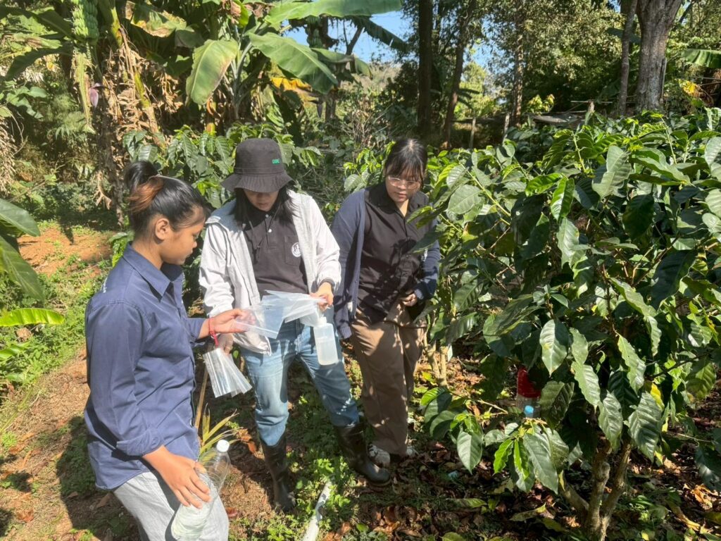 นางสาวนุชจารี วนาศิริ นักวิชาการส่งเสริมการเกษตรชำนาญการพิเศษ ปฏิบัติหน้าที่ผู้อำนวยการ ศทอ. เชียงใหม่ มอบหมายให้นางสาวเอมลิน พิพัฒนภักดี นวส.ชำนาญการ นางพรพรรณ จันทะวงษ์ นวส.ชำนาญการ นายยุทธนา เดือนดาว นายช่างเครื่องกลชำนาญงาน และนักศึกษาฝึกประสบการณ์วิชาชีพ ได้ลงพื้นที่เพื่อดำเนินการทดลองและเก็บผลงานวิจัยศึกษาประยุกต์ใช้เทคโนโลยีการจัดการสุขภาพพืชในสภาพพื้นที่และเหมาะสมกับการปฏิบัติของเกษตรกร (Appropriate technology) ณ แปลงกาแฟเกษตรกรในพื้นที่ ตำบลบ่อแก้ว อำเภอสะเมิง จังหวัดเชียงใหม่ จากการสำรวจแปลงกาแฟในโครงการวิจัยพบว่าต้นกาแฟอยู่ในระยะเก็บเกี่ยวผลผลิตใกล้หมดแล้ว พบการระบาดของราสนิมใบกาแฟ และโรคแอนแทรคโนสบนใบกาแฟเล็กน้อย จึงได้ฉีดพ่นเชื้อราไตรโคเดอร์มาในแปลงที่พบการระบาดของเชื้อรา และได้ทำความสะอาดสวน และแนะนำให้เกษตรกรตัดแต่งกิ่ง จัดทรงพุ่มให้โปร่ง โดยนำเศษซากพืชที่เป็นโรคได้นำไปทำปุ๋ยหมัก ผสมเชื้อราไตรโคเดอร์มา นอกจากนี้ ศทอ.เชียงใหม่ ได้สนับสนุนแมลงหางหนีบและสาธิตการปล่อยแมลงหางหนีบในแปลงของเกษตรกรเพื่อใช้ในการกำจัดแมลงศัตรูพืชต่อไป (เมื่อวันที่ 4 กุมภาพันธ์ 2569)