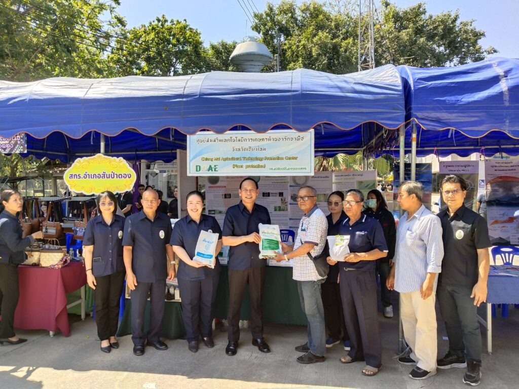 นางสาวนุชจารี วนาศิริ นักวิชาการส่งเสริมการเกษตรชำนาญการพิเศษ ปฏิบัติหน้าที่ผู้อำนวยการ ศทอ. เชียงใหม่ มอบหมายให้นางสาวกนกวรรณ สุดาแก้ว นวส.ปฏิบัติการ นายยุทธนา เดือนดาว นายช่างเครื่องกลชำนาญงาน และนางอุไร จันทา เจ้าพนักงานธุรการ ร่วมจัดนิทรรศการเพื่อให้บริการแก่เกษตรกรในงานโครงการคลินิกเกษตรเคลื่อนที่ในพระราชานุเคราะห์ สมเด็จพระบรมโอรสาธิราชฯ สยามมกุฎราชกุมาร ครั้งที่ 2 ประจำปีงบประมาณ 2569 ณ เทศบาลตำบลยุหว่า อำเภอสันป่าตอง จังหวัดเชียงใหม่ โดยมีนายบุญลือ ธรรมธรานุรักษ์ รองผู้ว่าราชการจังหวัดเชียงใหม่ เป็นประธานเปิดงานฯ จากการรับฟังปัญหาของเกษตรกรในพื้นที่ พบว่าเกษตรกรที่เข้ารับบริการในอำเภอสันป่าตองและอำเภอใกล้เคียง จำนวน 100 คน ส่วนใหญ่จะปลูกข้าว ลำไย และพืชผักสวนครัวเป็นพืชหลัก จึงมักจะพบโรคและแมลงที่สำคัญ อาทิเช่น ในข้าวพบโรคไหม้ เพลี้ยกระโดดสีน้ำตาล ลำไยพบโรคราดำ เพลี้ยแป้ง และพืชผักสวนครัวพบด้วงหมัดผัก เพลี้ยอ่อน เป็นต้น เพื่อแก้ไขปัญหาดังกล่าว ทางศทอ.จังหวัดเชียงใหม่ จึงได้สนับสนุนเชื้อราไตรโคเดอร์มาชนิดพร้อมใช้ จำนวน 10 กิโลกรัม เชื้อราบิวเวอเรียชนิดพร้อมใช้ จำนวน 10 กิโลกรัม แมลงหางหนีบ จำนวน 4,000 ตัว และสารสกัดสะเดา จำนวน 20 ขวด พร้อมเอกสารเผยแพร่ทางวิชาการ เพื่อใช้ในการป้องกันป้องกันกำจัดโรคและแมลงศัตรูพืชในพื้นที่ต่อไป (เมื่อวันที่ 12 กุมภาพันธ์ 2569