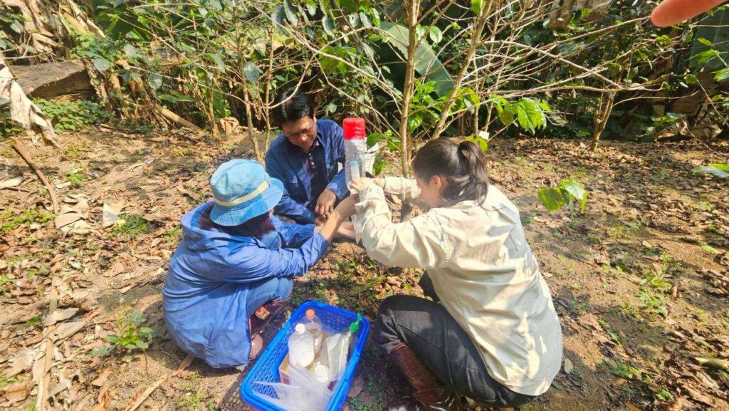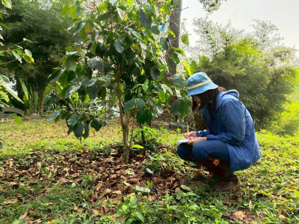 นางสาวนุชจารี วนาศิริ นักวิชาการส่งเสริมการเกษตรชำนาญการพิเศษ ปฏิบัติหน้าที่ผู้อำนวยการ ศทอ. เชียงใหม่ มอบหมายให้นางสาวเอมลิน พิพัฒนภักดี นวส.ชำนาญการ นางสาวพรพรรณ จันทะวงษ์ นวส.ชำนาญการ นางสาวกนกวรรณ สุดาแก้ว นวส.ปฏิบัติการ และนายยุทธนา เดือนดาว นายช่างเครื่องกลชำนาญงาน ได้ลงพื้นที่เพื่อดำเนินการทดลองและเก็บผลงานวิจัยศึกษาประยุกต์ใช้เทคโนโลยีการจัดการสุขภาพพืชในสภาพพื้นที่และเหมาะสมกับการปฏิบัติของเกษตรกร (Appropriate technology) ณ แปลงกาแฟเกษตรกรในพื้นที่ ตำบลบ่อแก้ว อำเภอสะเมิง จังหวัดเชียงใหม่ จากการสำรวจแปลงกาแฟในโครงการวิจัยพบว่าต้นกาแฟอยู่ในระยะออกดอก พบการระบาดของราสนิมใบกาแฟลดลงจากครั้งก่อน เนื่องจากมีการใช้เชื้อราไตรโคเดอร์มาในการควบคุมโรค ส่วนกับดักมอดกาแฟพบว่ามีปริมาณมอดเจาะผลกาแฟในกับดักเพิ่มมากขึ้น จึงนำมาตรวจนับในห้องปฏิบัติการต่อไป นอกจากนี้ได้มีการวัดค่าความชื้นในดิน pH ของดิน อุณหภูมิในดิน อุณหภูมิอากาศ ความชื้นสัมพัทธ์ในอากาศ และการตรวจเช็คสภาพปุ๋ยหมักจากเปลือกเชอร์รี่กาแฟด้วย (เมื่อวันที่ 5 มีนาคม 2569)