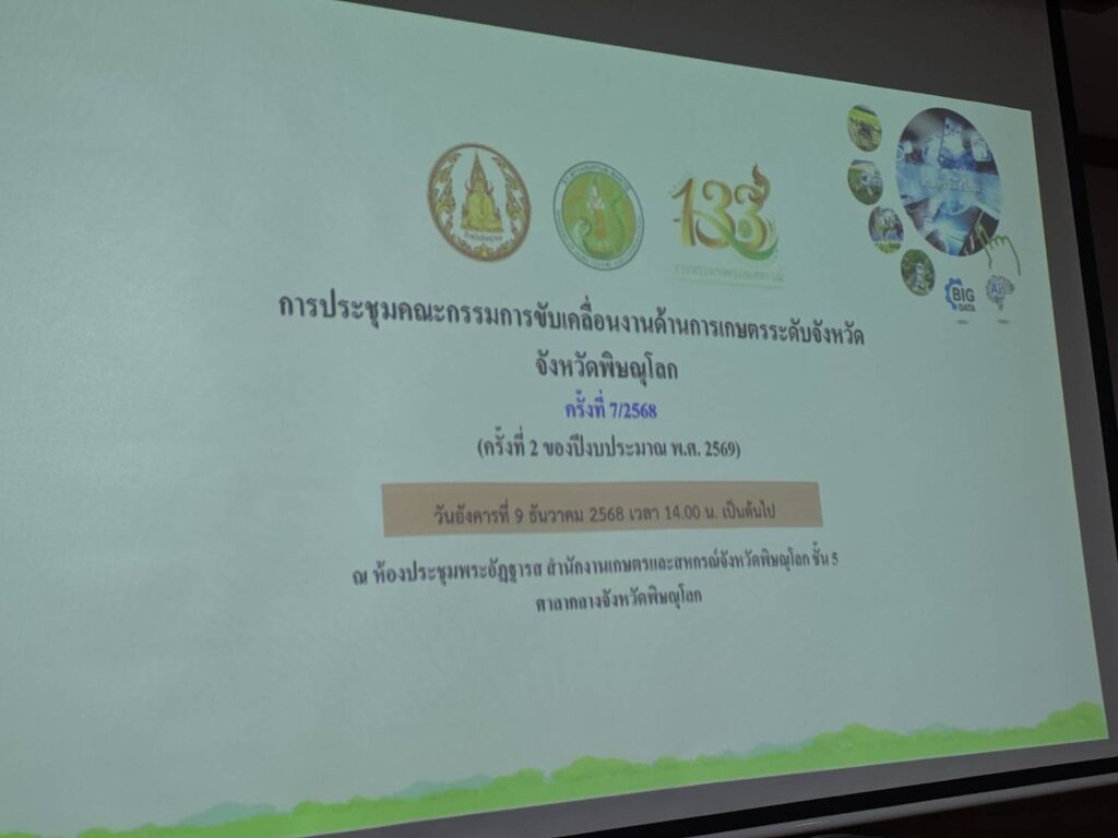 วันที่ 9 ธันวาคม 2568 นายประเสริฐ อินเกตุสมบูรณ์ ผู้อำนวยการศูนย์ส่งเสริมเทคโนโลยีการเกษตรด้านอารักขาพืช จังหวัดพิษณุโลก มอบหมายให้ นางสาวประภาทิพย์ พันธชาติ นักวิชาการส่งเสริมการเกษตรชำนาญการ ร่วมประชุมคณะกรรมการขับเคลื่อนงานด้านการเกษตรระดับจังหวัด จังหวัดพิษณุโลก ครั้งที่ 7/2568 โดย นางจีรนันท์ วาสุเทพรังสรรค์ เกษตรและสหกรณ์จังหวัดพิษณุโลก เป็นประธาน เปิดการประชุม ณ ห้องประชุมพระอัฎฐารส สำนักงานเกษตรและสหกรณ์จังหวัดพิษณุโลก ชั้น 5 ศาลากลางจังหวัดพิษณุโลก อำเภอเมืองพิษณุโลก จังหวัดพิษณุโลก