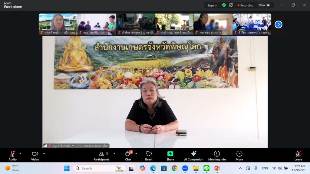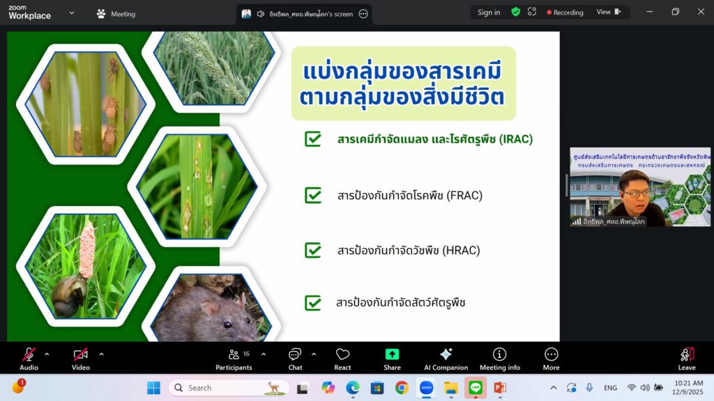 วันที่ 9 ธันวาคม 2568 นายประเสริฐ อินเกตุสมบูรณ์ ผู้อำนวยการศูนย์ส่งเสริมเทคโนโลยีการเกษตรด้านอารักขาพืช จังหวัดพิษณุโลก มอบหมายให้ นางเพื่อนแพง ขัติศรี นายอิทธิพล ยอดโค้น และ นักวิชาการส่งเสริมการเกษตรชำนาญการ เป็นวิทยากรบรรยายให้ความรู้ เรื่อง การวินิจฉัยศัตรูพืชเบื้องต้น การจำแนกศัตรูพืช/ศัตรูธรรมชาติ การป้องกันกำจัดศัตรูพืชด้วยวิธีผสมผสาน และการใช้สารเคมีกำจัดศัตรูพืชอย่างถูกต้องและปลอดภัย โครงการส่งเสริมการจัดการสุขภาพพืชเพื่อเพิ่มประสิทธิภาพการผลิตสินค้าเกษตร หลักสูตร การพัฒนาเกษตรกรผู้สำรวจแปลงติดตามสถานการณ์ศัตรูพืช ผ่านระบบ Zoom Meeting มีผู้เข้าร่วมอบรม จำนวน 47 ราย ณ ศูนย์ส่งเสริมเทคโนโลยีการเกษตรด้านอารักขาพืช จังหวัดพิษณุโลก ตำบลอรัญญิก อำเภอเมืองพิษณุโลก จังหวัดพิษณุโลก