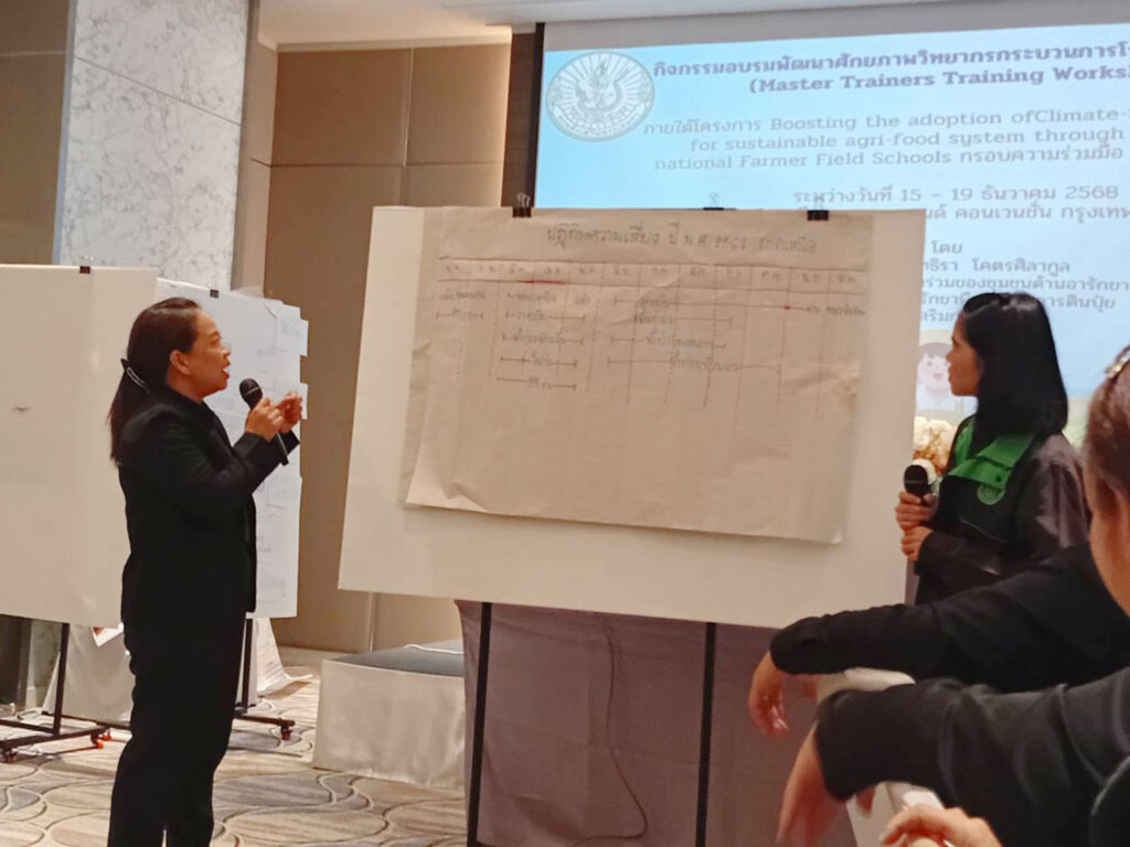 วันที่ 19 ธันวาคม 2568 นายประเสริฐ อินเกตุสมบูรณ์ ผู้อำนวยการศูนย์ส่งเสริมเทคโนโลยีการเกษตรด้านอารักขาพืช จังหวัดพิษณุโลก มอบหมายให้ นางสาวสุดารัตน์ แก้วน้ำอ่าง นักวิชาการส่งเสริมการเกษตรปฏิบัติการ เข้าร่วมกิจกรรมอบรมพัฒนาศักยภาพวิทยากรกระบวนการโรงเรียนเกษตรกร (Master Trainers Training workshop) โครงการ Boosting the adoption of Climate – Smart Agriculture for sustainable Agri – food system through Thailand’s national Farmer Field Schools เพื่อเรียนรู้เรื่องการจัดทำแผนและหลักสูตรการอบรม Training of Trainer Facilitator program (TOF) และแผนการดำเนินการที่เหมาะสมของแต่ละพื้นที่ ณ โรงแรมทีเค พาเลซ แอนด์คอนเวนชั่น กรุงเทพมหานคร