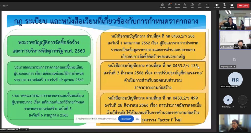 วันที่ 24 ธันวาคม 2568 นายประเสริฐ อินเกตุสมบูรณ์ ผู้อำนวยการศูนย์ส่งเสริมเทคโนโลยีการเกษตรด้านอารักขาพืช จังหวัดพิษณุโลก มอบหมายให้ นายอิทธิพล ยอดโค้น นักวิชาการส่งเสริมการเกษตรชำนาญการ เข้าร่วมการอบรมหลักสูตร “ระบบคำนวณราคากลางงานก่อสร้าง” ซึ่งจัดโดยสำนักงานคลังจังหวัดพิษณุโลก ในรูปแบบ การอบรมออนไลน์ผ่านโปรแกรม Microsoft Teams การอบรมดังกล่าว จัดขึ้นเพื่อเสริมสร้างความรู้ ความเข้าใจเกี่ยวกับหลักเกณฑ์ วิธีการ และการใช้ระบบคำนวณราคากลางงานก่อสร้างให้ถูกต้องตามระเบียบที่เกี่ยวข้องตลอดจนสามารถนำความรู้ที่ได้รับไปประยุกต์ ใช้ในการปฏิบัติงานด้านการจัดซื้อจัดจ้างและงานที่เกี่ยวข้องได้อย่างมีประสิทธิภาพ การเข้าร่วมอบรมในครั้งนี้เป็นการพัฒนาศักยภาพบุคลากรของหน่วยงานให้มีความรู้ความสามารถเพิ่มขึ้น และสนับสนุน การปฏิบัติงานของทางราชการ ให้มีความโปร่งใส ถูกต้อง และเกิดประโยชน์สูงสุด