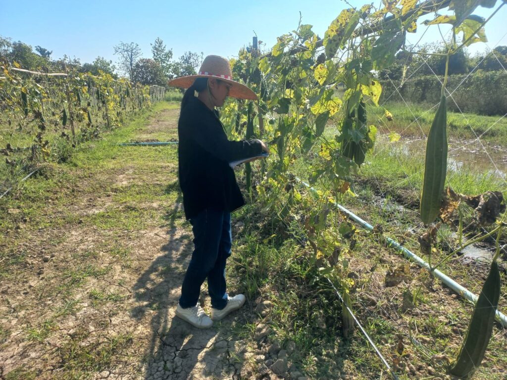 วันที่ 7 มกราคม 2569 นายประเสริฐ อินเกตุสมบูรณ์ ผู้อำนวยการศูนย์ส่งเสริมเทคโนโลยีการเกษตรด้านอารักขาพืช จังหวัดพิษณุโลก มอบหมายให้ นางเพื่อนแพง ขัติศรี นักวิชาการส่งเสริมการเกษตรชำนาญการ ติดตามโครงการส่งเสริมการจัดการสุขภาพพืชเพื่อเพิ่มประสิทธิภาพการผลิตสินค้าเกษตร ปีงบประมาณ พ.ศ.2569 กิจกรรมสำรวจศัตรูพืชและจัดเก็บข้อมูลสภาพแวดล้อมในแปลงเพื่อการพัฒนาแอปพลิเคชัน DOAE PEST FORECAST ณ ศูนย์ผลิตเมล็ดพันธุ์พืชพระราชทานกองพันซ่อมบำรุงที่ 23 ค่ายสมเด็จพระเอกาทศรถ ตำบลอรัญญิก อำเภอเมืองพิษณุโลก จังหวัดพิษณุโลก ดำเนินการจัดเก็บสภาพแวดล้อมในแปลงเพื่อการพัฒนาแอปพลิเคชัน DOAE PEST FORECAST และสำรวจศัตรูพืชแปลงบวบเหลี่ยม อยู่ในระยะให้ผลผลิต สภาพอากาศในแปลงปลูก มีอุณหภูมิ 28.1 องศาเซลเซียส ความชื้นสัมพัทธ์ 43 % พบการทำลายของโรคราน้ำค้าง และระยะตัวอ่อนของด้วงเต่ามะเขือ ส่วนศัตรูธรรมชาตที่พบคือ ระยะดักแด้แตนเบียน