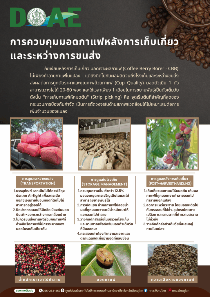 ศทอ.พิษณุโลก แจ้งเฝ้าระวัง และหมั่นสำรวจแปลง : การควบคุมมอดกาแฟหลังการเก็บเกี่ยวและระหว่างการขนส่งBy pmc09 / 16 กุมภาพันธ์ 2026