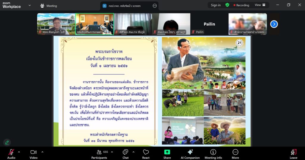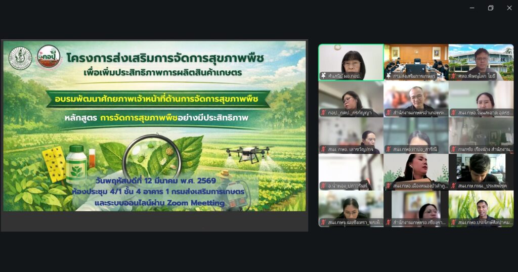 วันที่ 12 มีนาคม 2569 นายประเสริฐ อินเกตุสมบูรณ์ ผู้อำนวยการศูนย์ส่งเสริมเทคโนโลยีการเกษตรด้านอารักขาพืช จังหวัดพิษณุโลก มอบหมายให้ นายโยธี เปล่งขำ นักวิชาการส่งเสริมการเกษตรชำนาญการ ร่วมการอบรมพัฒนาศักยภาพหน้าที่ด้านการจัดการสุขภาพพืช หลักสูตร การจัดการสุขภาพพืชอย่างมีประสิทธิภาพ เพื่อถ่ายทอดความรู้ให้แก่เจ้าหน้าที่ ให้มีความรู้และทักษะในการเป็นนักส่งเสริมอย่างมืออาชีพ เป็นทีมเรียนรู้การถ่ายทอดความรู้สู่เกษตรกร พร้อมแลกเปลี่ยนเรียนรู้ประสบการณ์ ความรู้ทางวิชาการ เทคโนโลยี นวัตกรรมที่จะนำไปสู่การวางแผนการพัฒนาในพื้นที่ ผ่านโปรแกรม Zoom Meeting ณ ศูนย์ส่งเสริมเทคโนโลยีการเกษตรด้านอารักขาพืช จังหวัดพิษณุโลก ตำบลอรัญญิก อำเภอเมืองพิษณุโลก จังหวัดพิษณุโลก