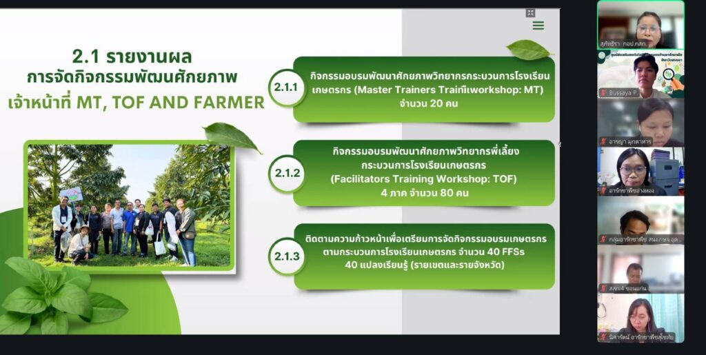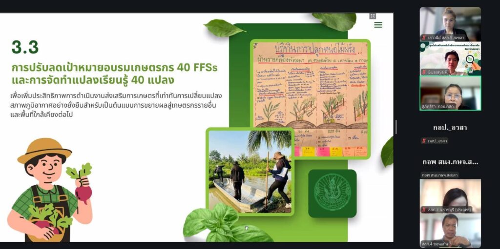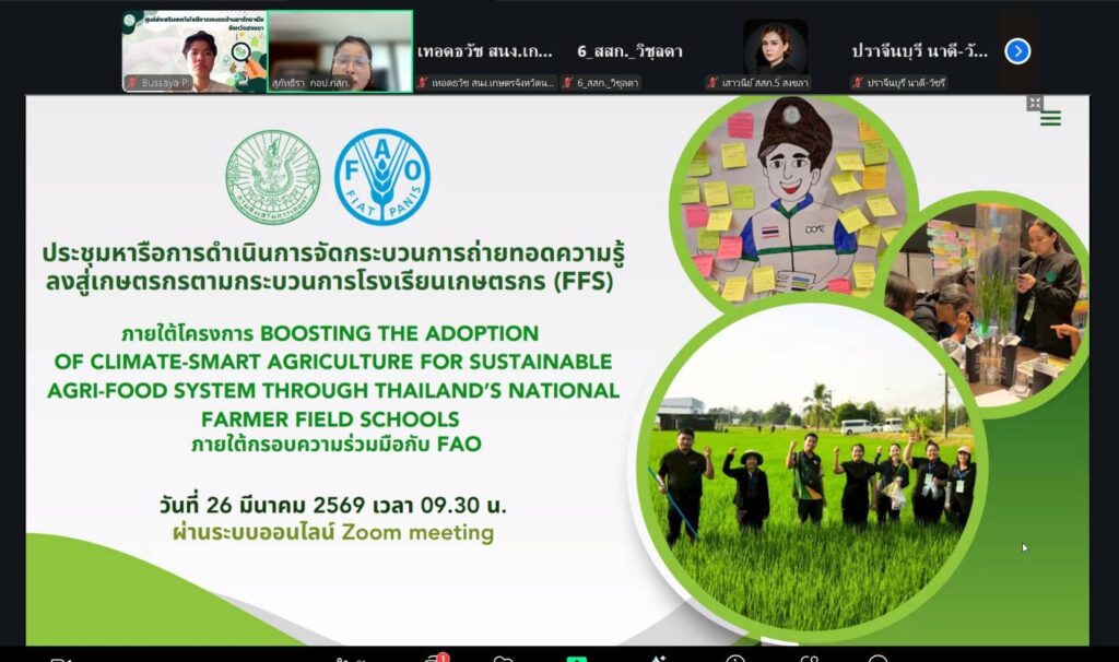 วันที่ 26 มีนาคม 2569 นายประเสริฐ อินเกตุสมบูรณ์ ผู้อำนวยการศูนย์ส่งเสริมเทคโนโลยีการเกษตร ด้านอารักขาพืชจังหวัดพิษณุโลก มอบหมายให้ นางสาวสุดารัตน์ แก้วน้ำอ่าง นักวิชาการส่งเสริมการเกษตรปฏิบัติการ ร่วมประชุมหารือการดำเนินการจัดกระบวนการถ่ายทอดความรู้ลงสู่เกษตรกรตามกระบวนการโรงเรียนเกษตรกร (Farmer Field School) ภายใต้โครงการ Boosting the adoption of Climate-Smart Agriculture for sustainable agri-food system through Thailand’s national Farmer Field Schools ภายใต้กรอบความร่วมมือกับ FAO ผ่านระบบออนไลน์ Zoom Meeting ณ ศูนย์ส่งเสริมเทคโนโลยีการเกษตรด้านอารักขาพืช จังหวัดพิษณุโลก ตำบลอรัญญิก อำเภอเมืองพิษณุโลก จังหวัดพิษณุโลก