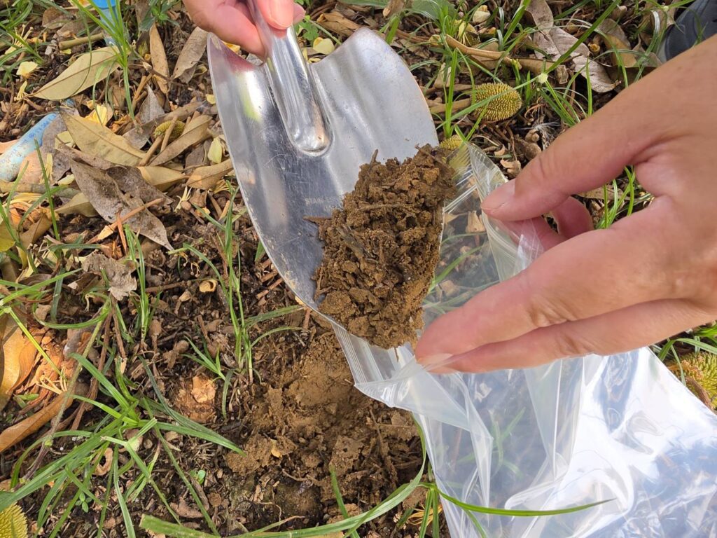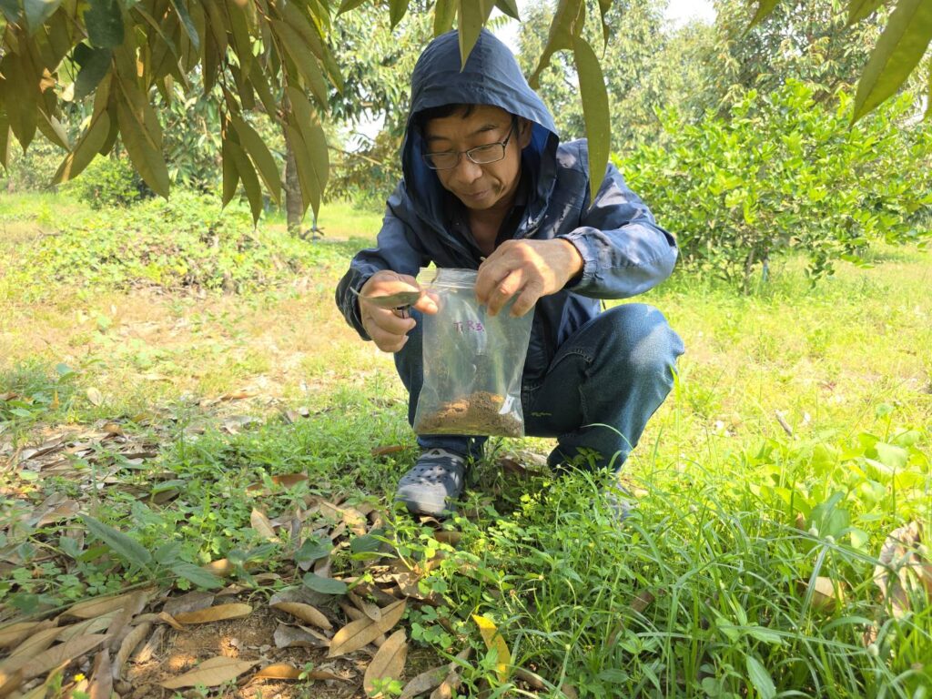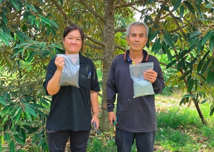 วันที่ 8 เมษายน 2569 เวลา 10.00 น . นายประเสริฐ อินเกตุสมบูรณ์ ผู้อำนวยการศูนย์ส่งเสริมเทคโนโลยีการเกษตรด้านอารักขาพืช จังหวัดพิษณุโลก มอบหมายให้ นางสาวประภาทิพย์ พันธชาติ นักวิชาการส่งเสริมการเกษตรชำนาญการ ลงพื้นที่สำรวจโรคและแมลงศัตรูทุเรียน และศึกษาวิจัยเรื่อง การทดสอบประสิทธิภาพของเชื้อราไตรโคเดอร์มาอัดเม็ด ในการป้องกันโรครากเน่าโคนเน่าทุเรียน โดยทำการใส่เชื้อราไตรโคเดอร์มาชนิดสด และเชื้อราไตรโคเดอร์มาอัดเม็ด ลงดินรอบต้นทุเรียน และเก็บตัวอย่างดิน เพื่อทำการตรวจสอบความมีชีวิตของเชื้อราไตรโคเดอร์มาในสภาพพื้นที่ ณ สวนทุเรียน ตำบลบ้านตึก อำเภอศรีสัชนาลัย จังหวัดสุโขทัย